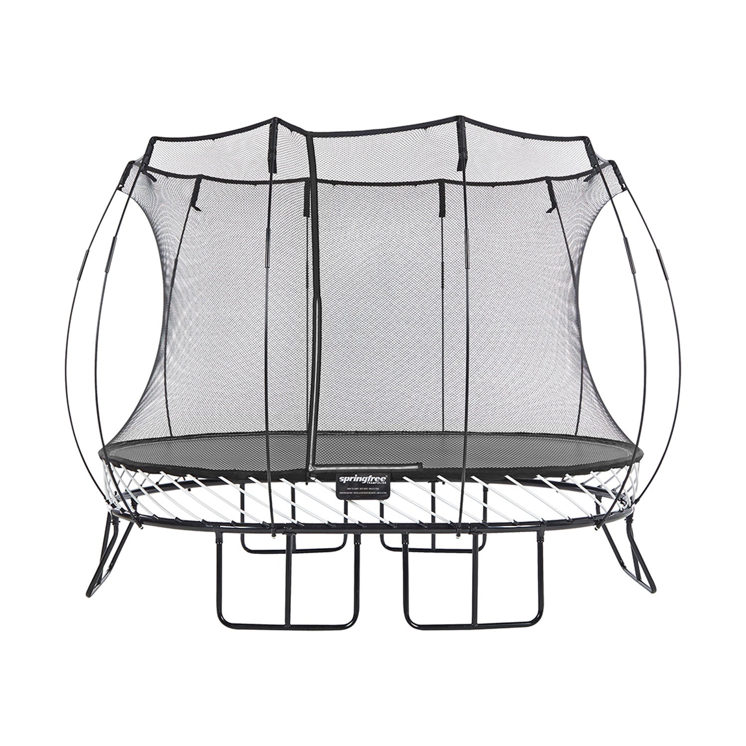 A: This Springfree trampoline eliminates metal springs, replacing them with flexible composite rods beneath the jumping surface. It also includes a soft-edge mat and a flexible safety net to reduce impact injuries.