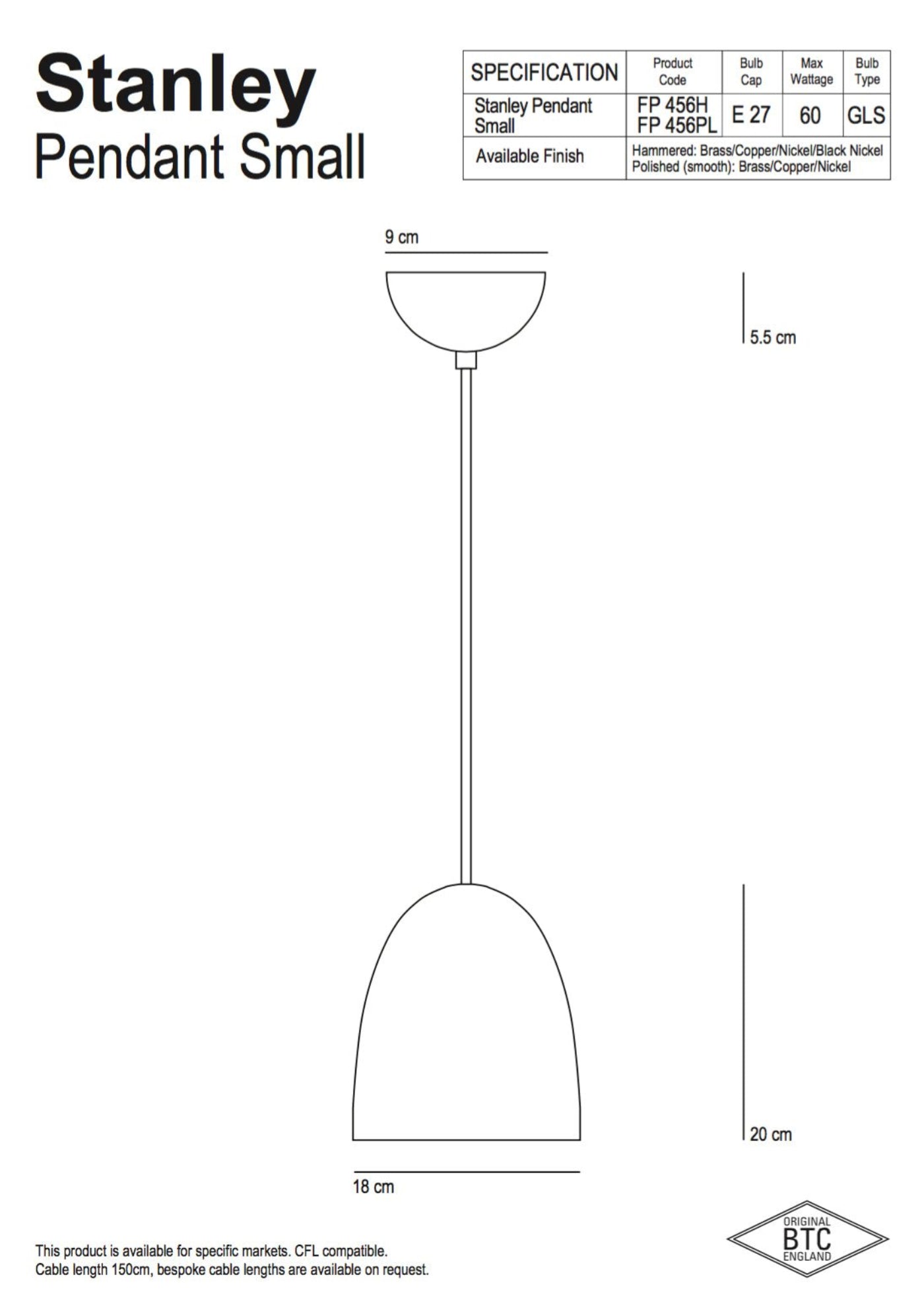 The Stanley Pendant Lights are hand spun from brass, copper or nickel plated brass with either a hammered or smooth finish. A dramatic hammered Black nickel finish has been added to the range, updating the collection while complementing the existing range. All lights have matching colored ceiling roses, with black cotton braided cables. The lights are available in 3 sizes which can be grouped together or mix metals for an eclectic look.