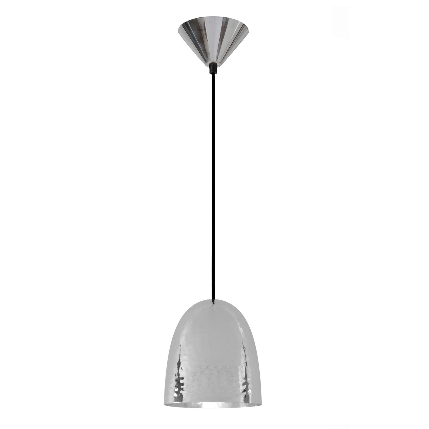 A: A single pendant light with a hammered silver finish, blending classic and modern styles.