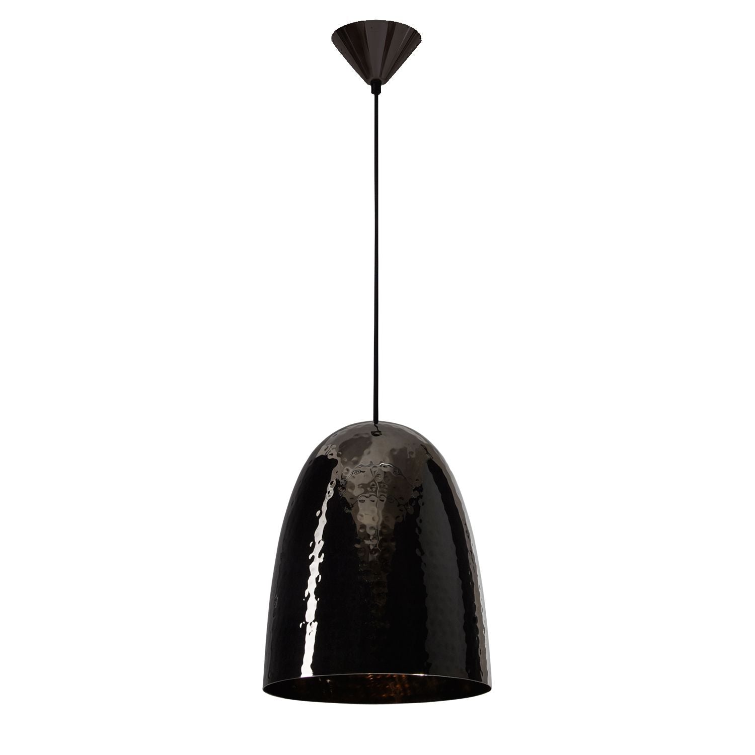 A: A modern pendant light featuring three black shades with a hammered metal texture, offering a stylish, contemporary look.