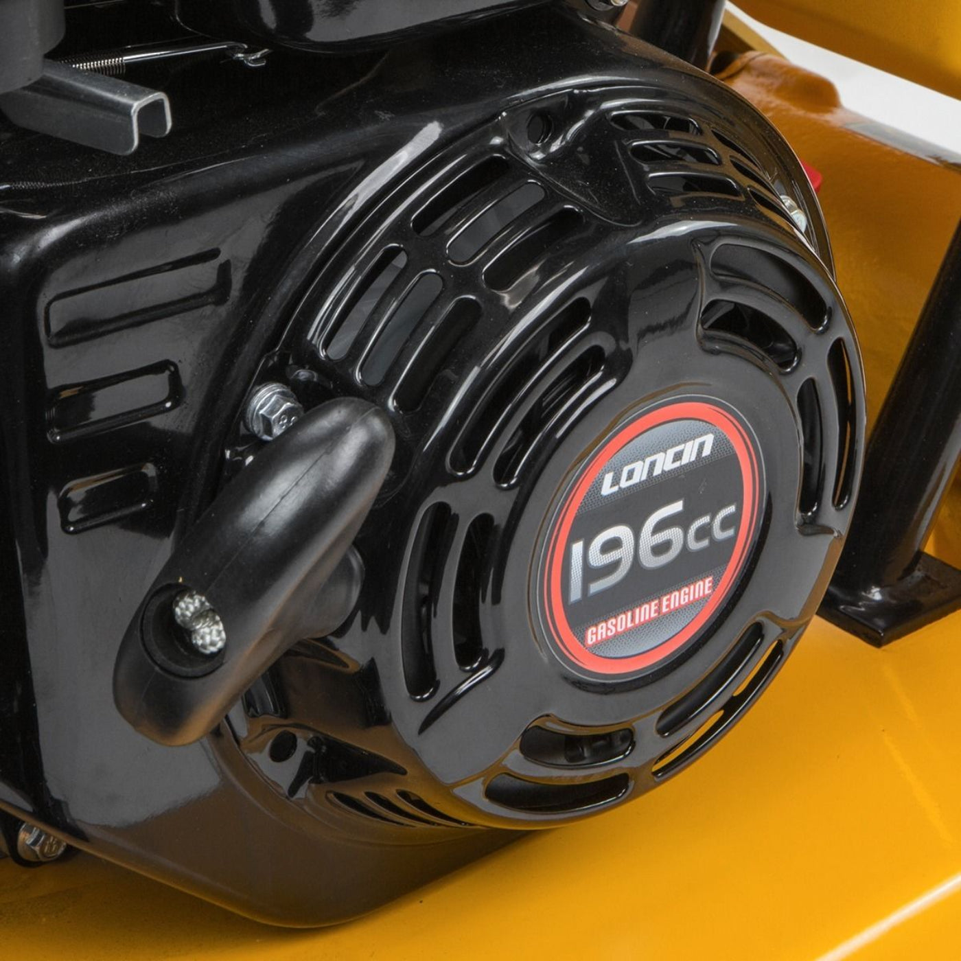 A: This gas-powered compactor features a 6.5HP 196cc engine, 4,000 lbs of compaction force, and a built-in water tank, making it ideal for soil, gravel, and asphalt compaction.