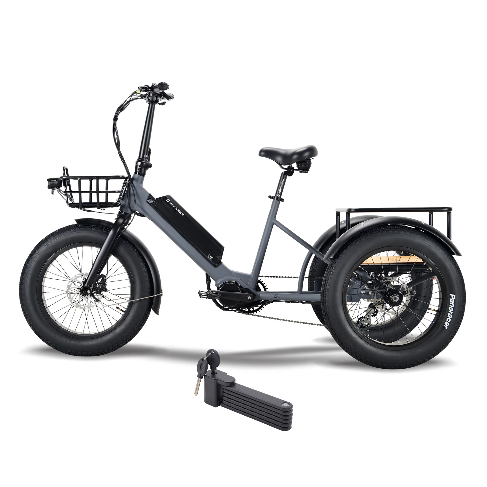 Exclusive Limited Time Offer: Bikeberry.com customers will receive a FREE Poplock bicycle lock with the purchase of the Surface 604 500W 48V Trio Mid Drive Folding Step-Thru Fat Tire Trike Electric Bike ($84.95 value!)