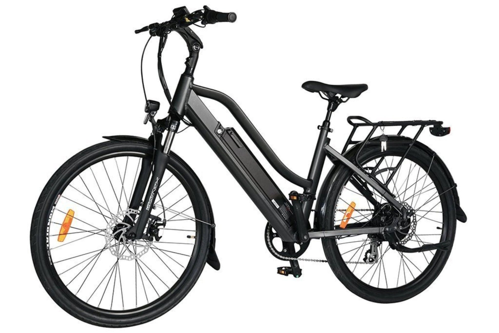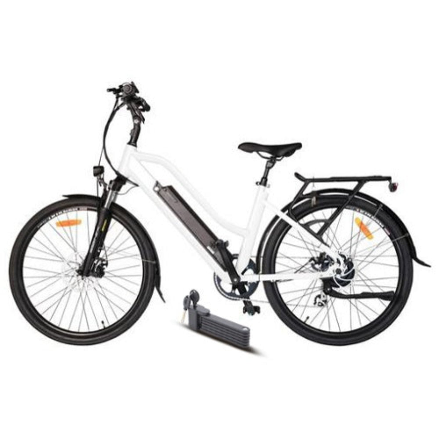 A: A sleek, user-friendly e-bike with a low step-through frame, ideal for urban commuting and recreational riding.
