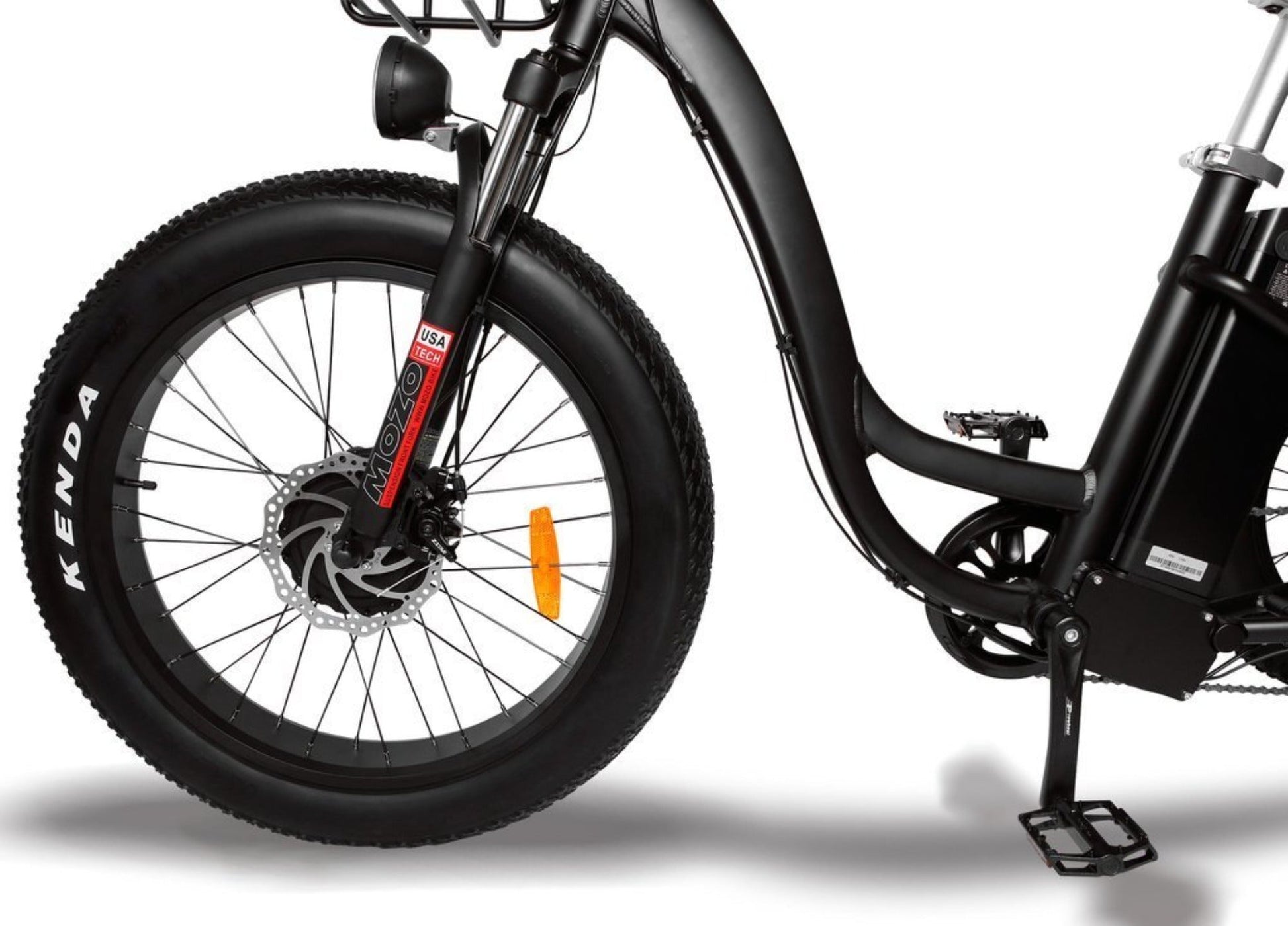 A: It is equipped with 24-inch front and 20-inch rear Kenda fat tires (4.0 inches wide) for enhanced stability and traction on diverse surfaces.