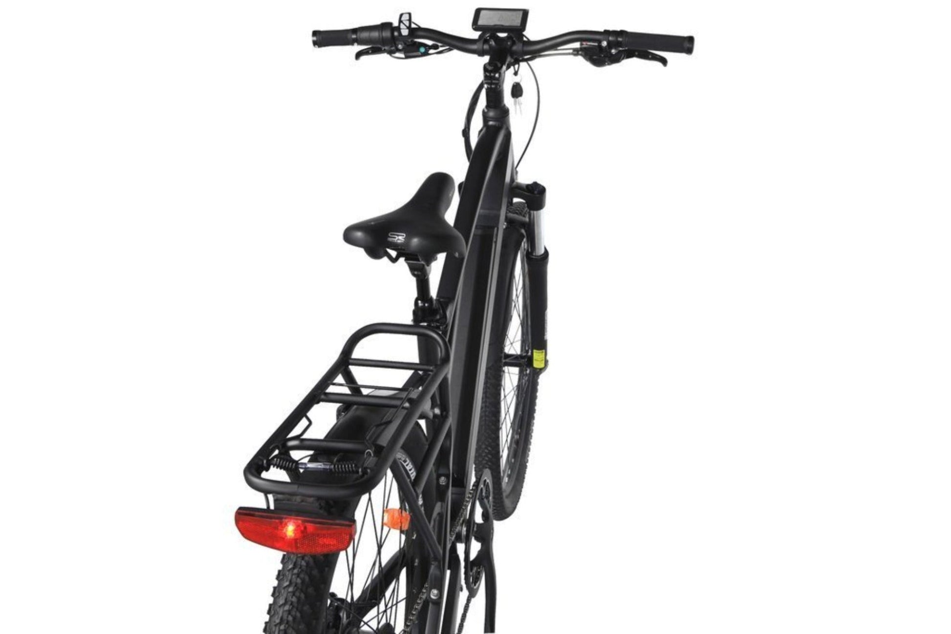 Ready for Adventure: Comes equipped with front and rear LED lights, full mudguards, and a rear carrier rack for added convenience on longer rides.