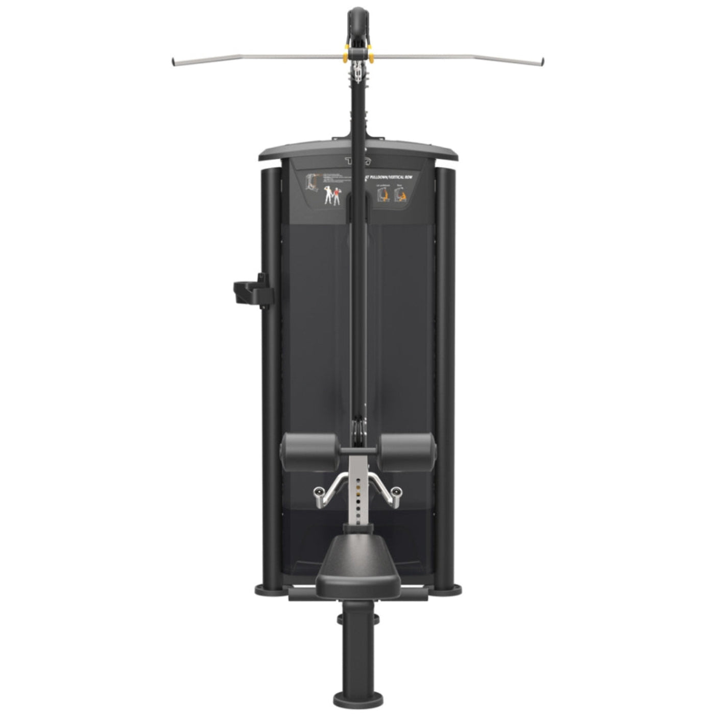 Constructed from sturdy 10 and 11-gauge steel with a powder-coated finish, TAG Elite Lat Pulldown/Vertical Row is built to withstand rigorous use. The sleek black, commercial-rated upholstery is designed for daily use, and bright yellow adjustment knobs facilitate easy exercise changes.