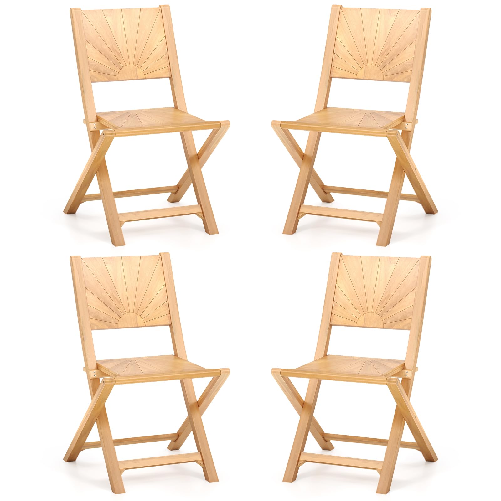 A: This set includes 2 or 4 folding patio chairs, each featuring a comfortable sun-patterned backrest, sturdy metal frame, and breathable fabric seat for outdoor relaxation.