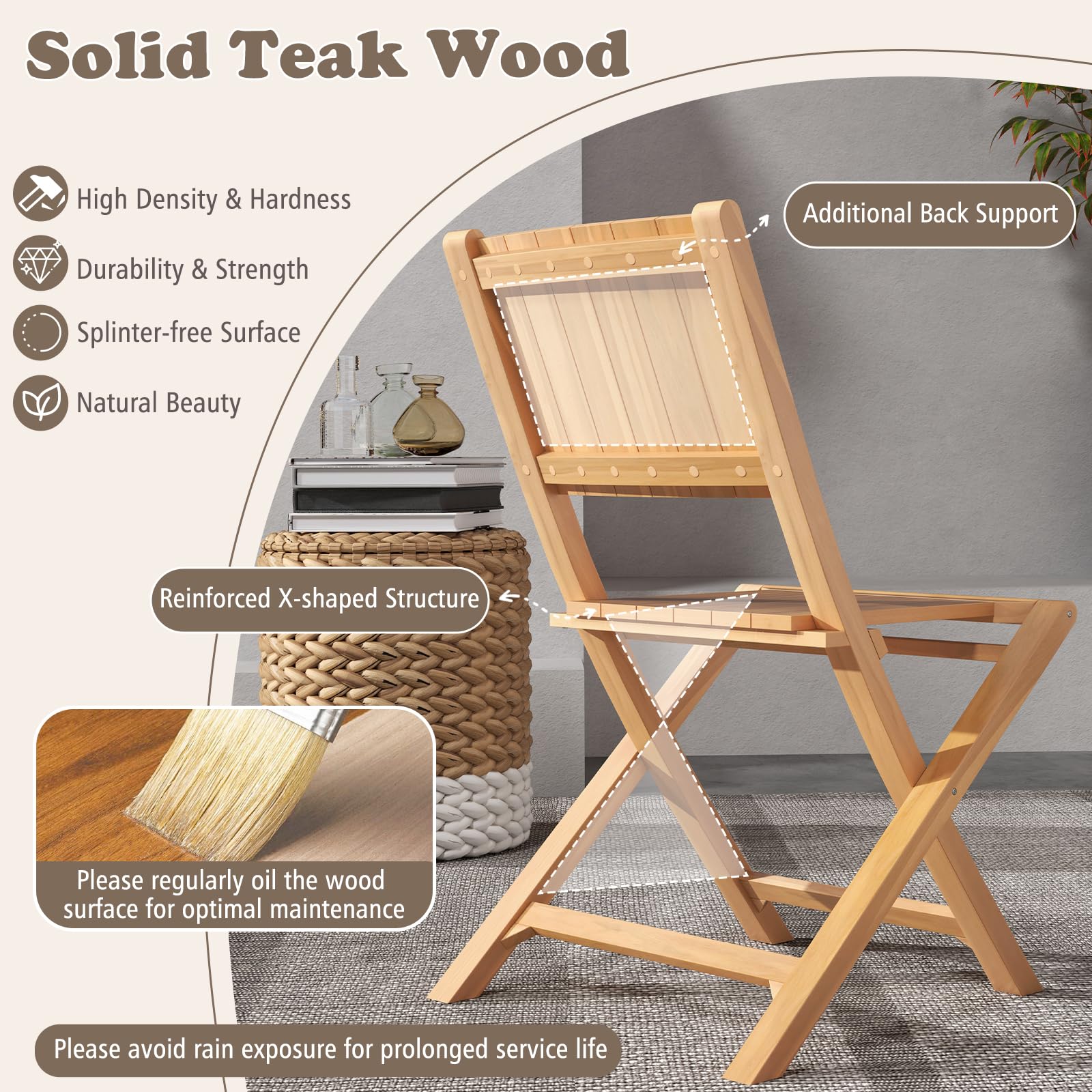 Beautifully crafted from solid teak with a splinter-free finish, these outdoor dining chairs boast natural beauty and exceptional durability. The smart foldable design allows for easy storage and optimal convenience. Moreover, the 105° inclined backrest ensures maximum comfort during your relaxation. These portable chairs’ natural colors can be transformed into colorful designs by DIY painting. Perfect for any porch, balcony or garden, these wood folding chairs combine elegance and practicality in one.