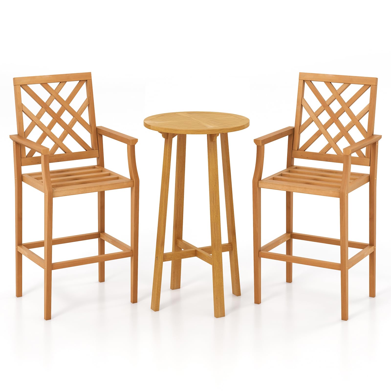 A: The set includes two teak wood bar chairs with backrests, armrests, and footrests, along with a matching teak wood bistro table, perfect for outdoor dining and lounging.