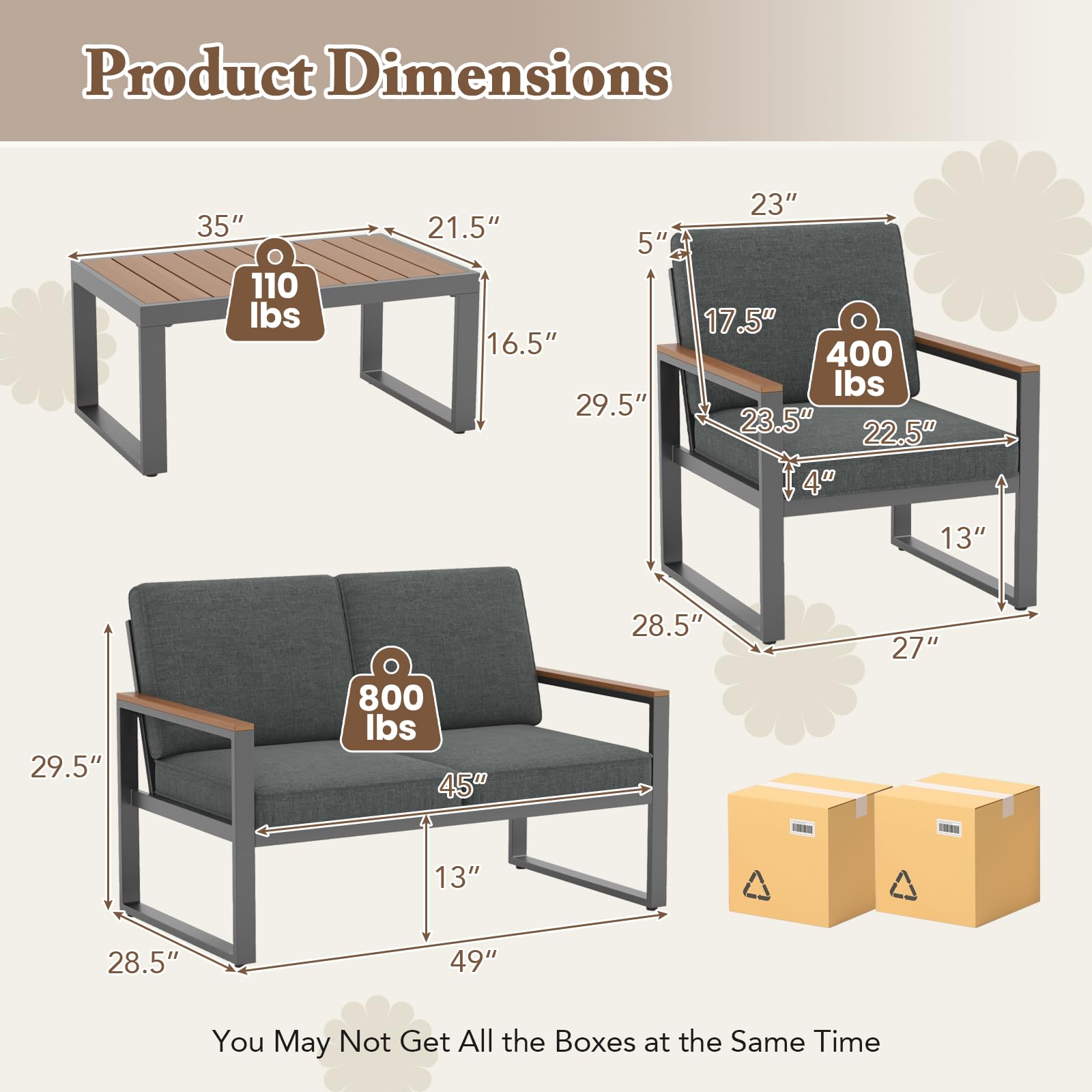 - Flexible Combination: This sectional sofa set includes 4 pieces that can be arranged in various configurations, fitting any patio size and meeting different seating needs. Rearrange as you wish to adapt to parties, family gatherings or solitary moments. Dimension of loveseat: 28.5β x 49β x 29.5β (L x W x H). Dimension of armchair: 28.5β x 27β x 29.5β (L x W x H). Dimension of coffee table: 35β x 21.5β x 16.5β (L x W x H).
