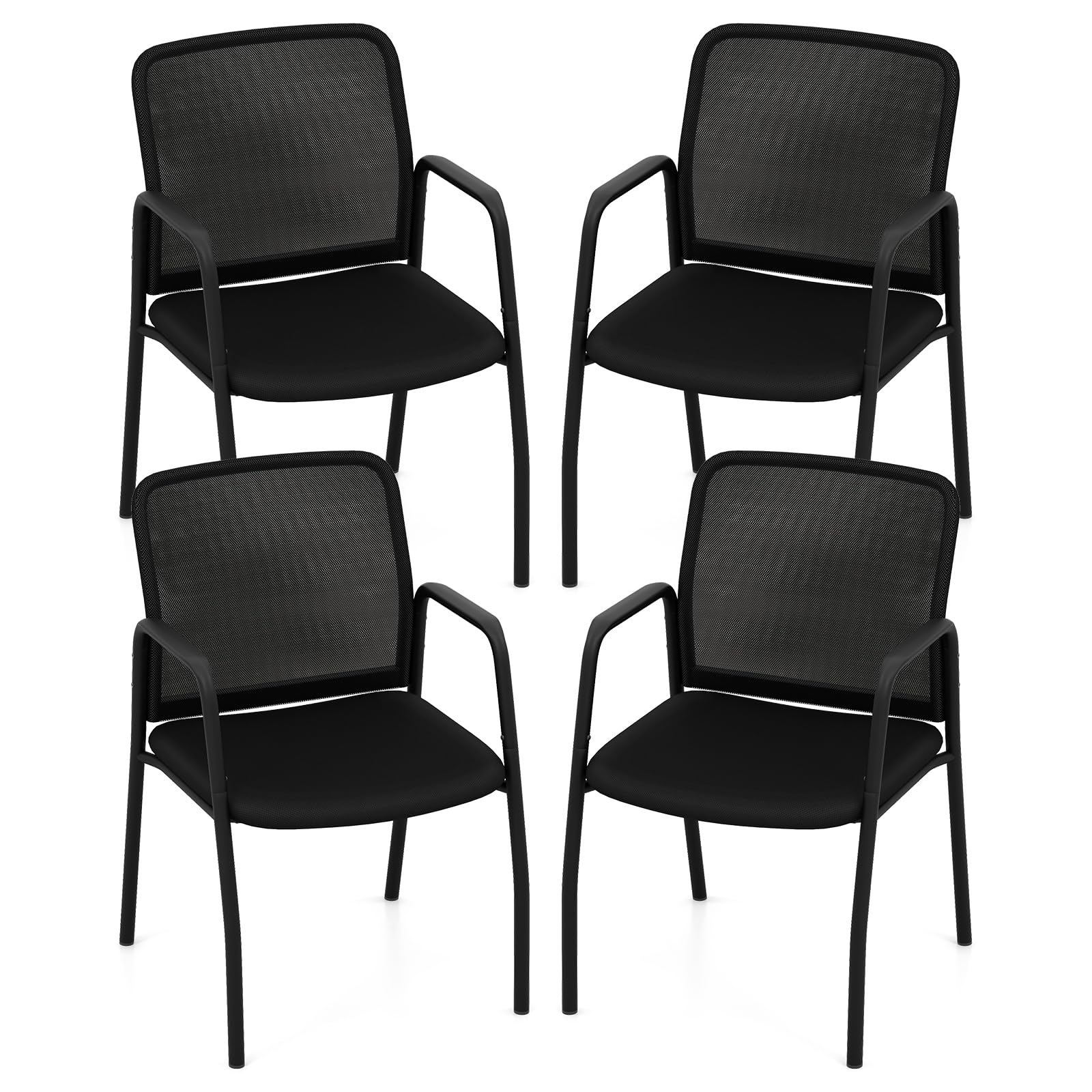 A: This set includes 6 office guest chairs, each designed with an ergonomic mesh backrest, padded seat, and sturdy metal frame for durability and comfort.