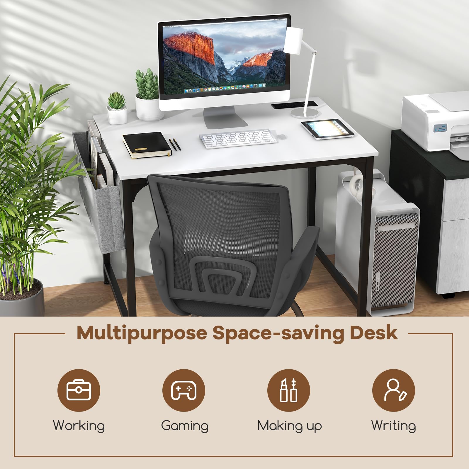 It boasts built-in charging station, keeping your devices powered up and ready for action. In addition, the spacious desktop provides ample room to spread out your essentials while the storage bag and headphone hook ensure items are easily accessible, promoting a tidy environment that's conducive to working efficiently. Crafted with a robust metal frame and reinforced bracket, this writing desk is built to last and provides reliable support. Moreover, this versatile home office desk acts well as a functional workstation, an elegant writing desk, or a gaming desk, perfect for a variety of rooms.