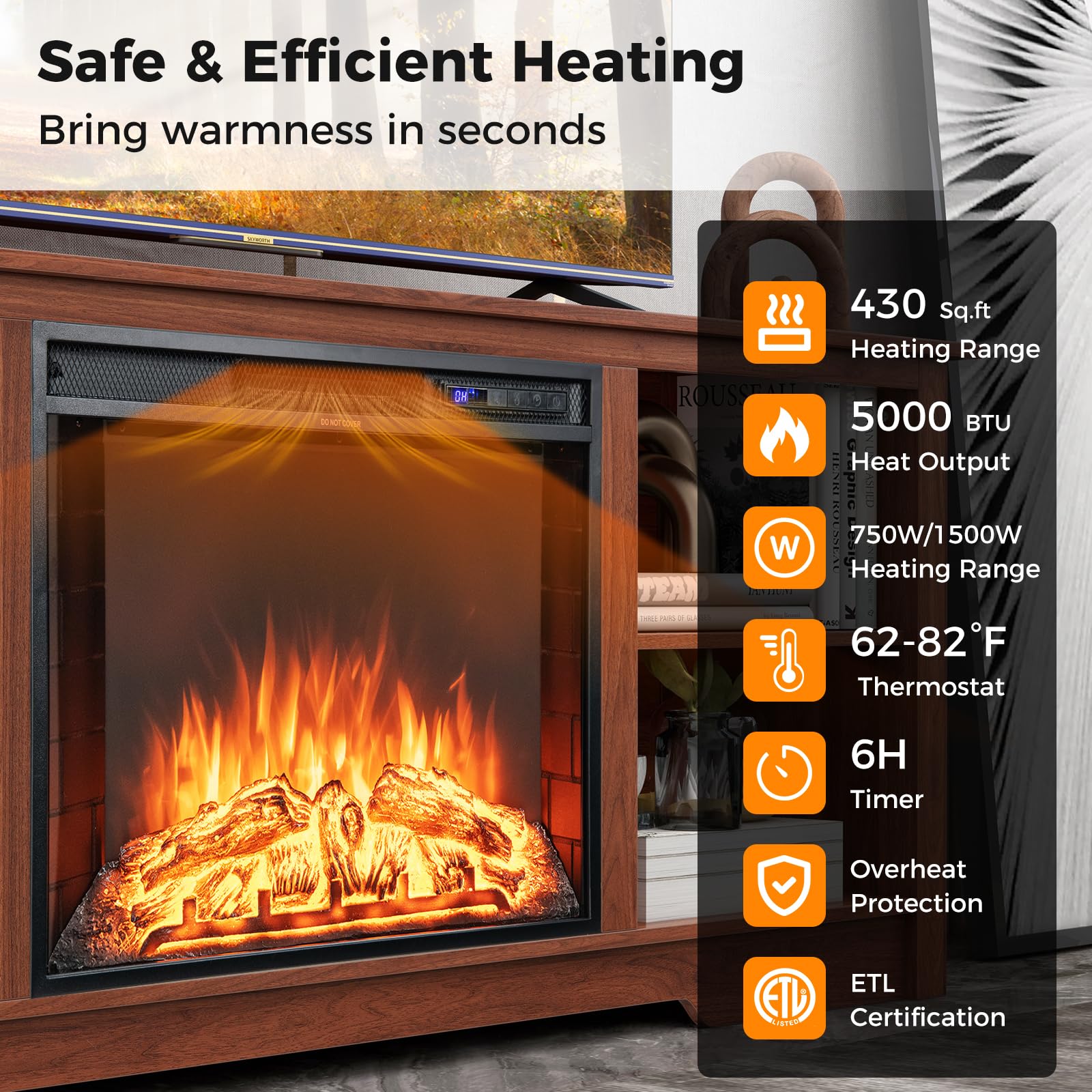 Realistic Electric Fireplace: The electric fireplace provides warmth and ambiance with adjustable temperature settings and LED flames, making it ideal for colder months.