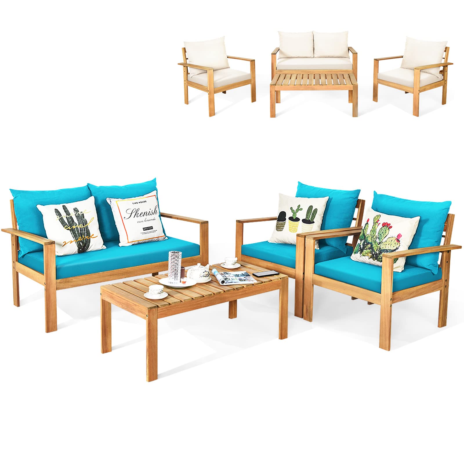 Tangkula Outdoor 4-Piece Acacia Wood Chat Set - HW64146WH-C+HW64146TU+