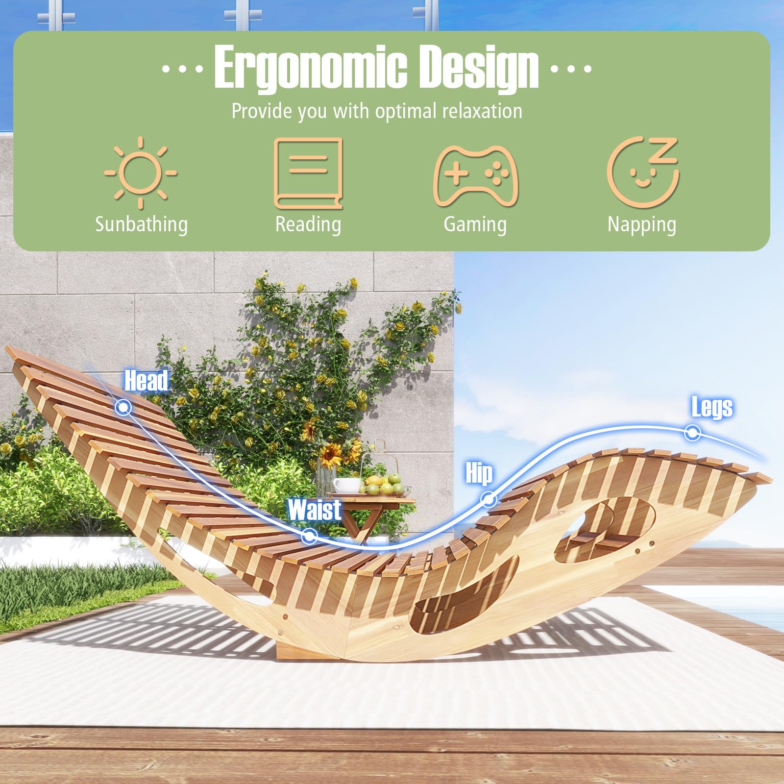 Constructed from high-quality acacia wood, this wooden loveseat rocker offers a gentle rocking function with anti-tipping stoppers at the base for added safety. The natural wood ensures longevity and reliability. Moreover, the ergonomically designed seat provides optimal support, creating a comfortable seating experience. With its touch of natural charm, this acacia wood rocking sunbed is a perfect spot for leisure activities such as sunbathing, reading, or napping, making it a versatile addition to your garden, patio, poolside, or any other outdoor setting.