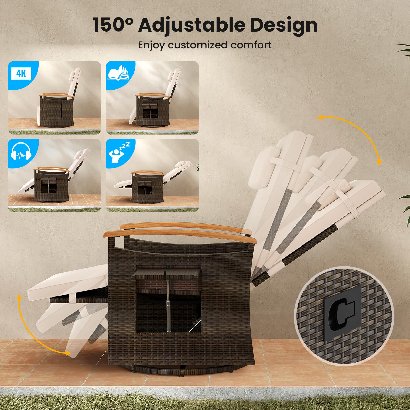 This swiveling lounge chair features a 150° adjustable backrest, allowing you to customize your comfort whether you’re indulging in a good book or taking a peaceful nap. The 360° smooth swiveling base provides the freedom to enjoy your surroundings, which is perfect for conversation or gathering. Constructed with sunproof and anti-fading PE wicker, this chair promises long-term beauty and use. The full-length cushion and headrest, secured with hook and loop fasteners, offer luxurious comfort and easy maintenance. Perfectly complemented by an acacia wood armrest and foldable side table, this recliner is a stylish yet built-to-last addition for outdoor places. Embrace this perfect blend of style and functionality in your own backyard.