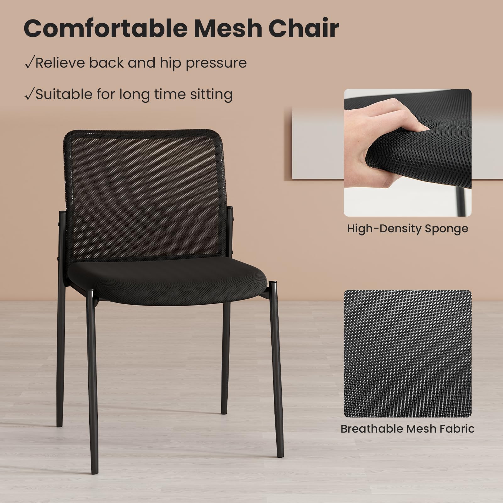 Experience ultimate comfort and durability with our modern upholstered chair. The ergonomic backrest promotes proper posture and reduces back strain, while the breathable mesh fabric ensures ventilation. The comfortable padded seat with high-density sponge offers extended relaxation for prolonged sitting periods. The sturdy metal frame with rustproof coating provides reliability and stability, with non-slip foot pads to protect your floors. The space-saving stackable design is ideal for offices, conference rooms, or clinics. Easy assembly and maintenance make this chair suitable for any environment.