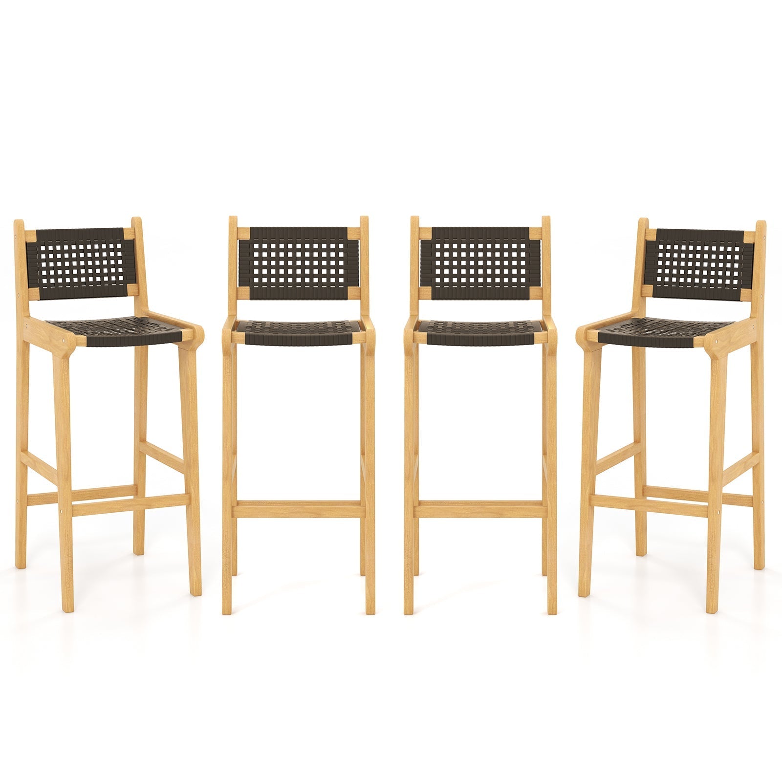 A: The set includes one 30-inch rattan bar stool with a backrest and footrest, made with teak wood and designed for comfortable bar or counter seating.