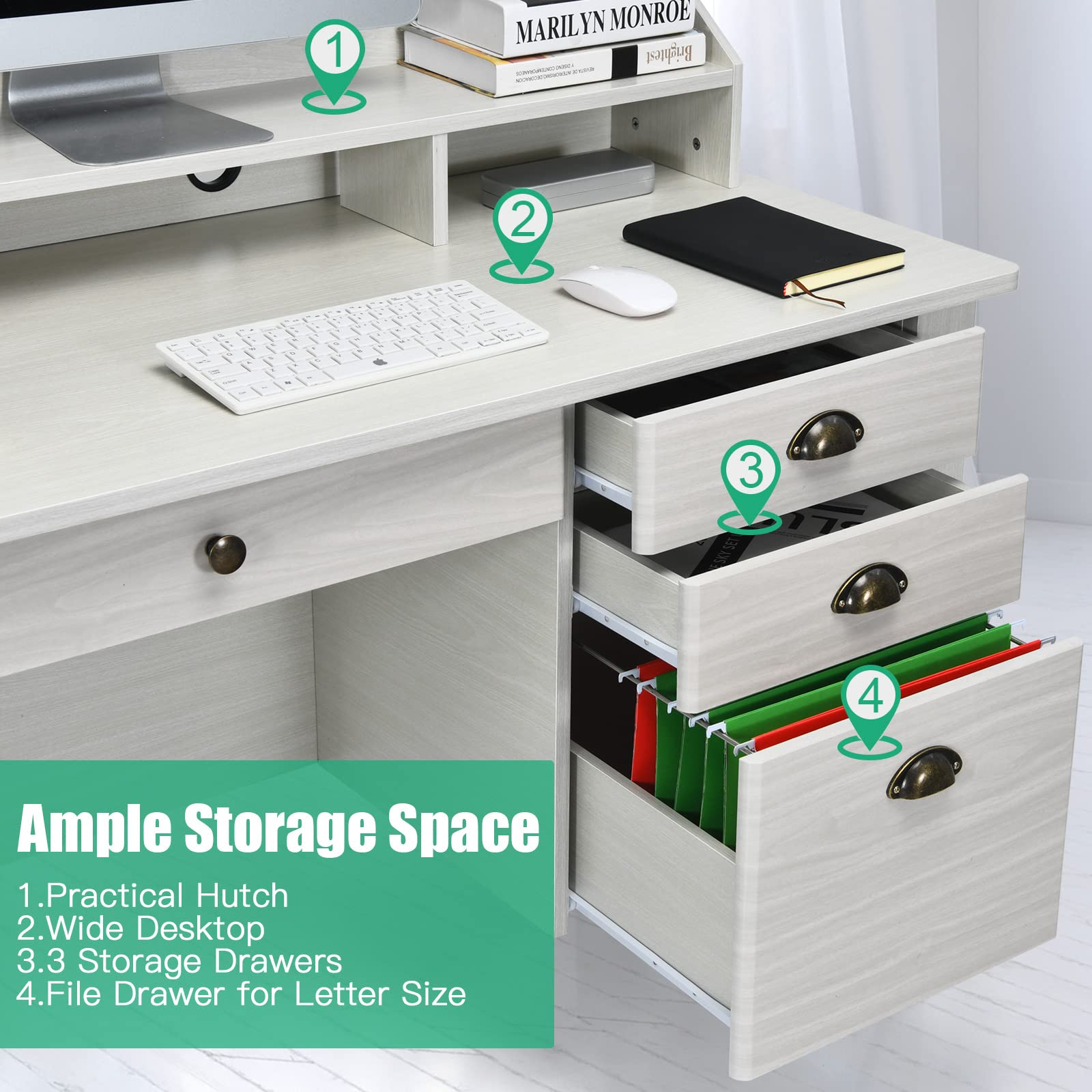 A: This desk features a spacious 48" tabletop, a hutch with open shelves, and 4 storage drawers, offering ample workspace and organization.