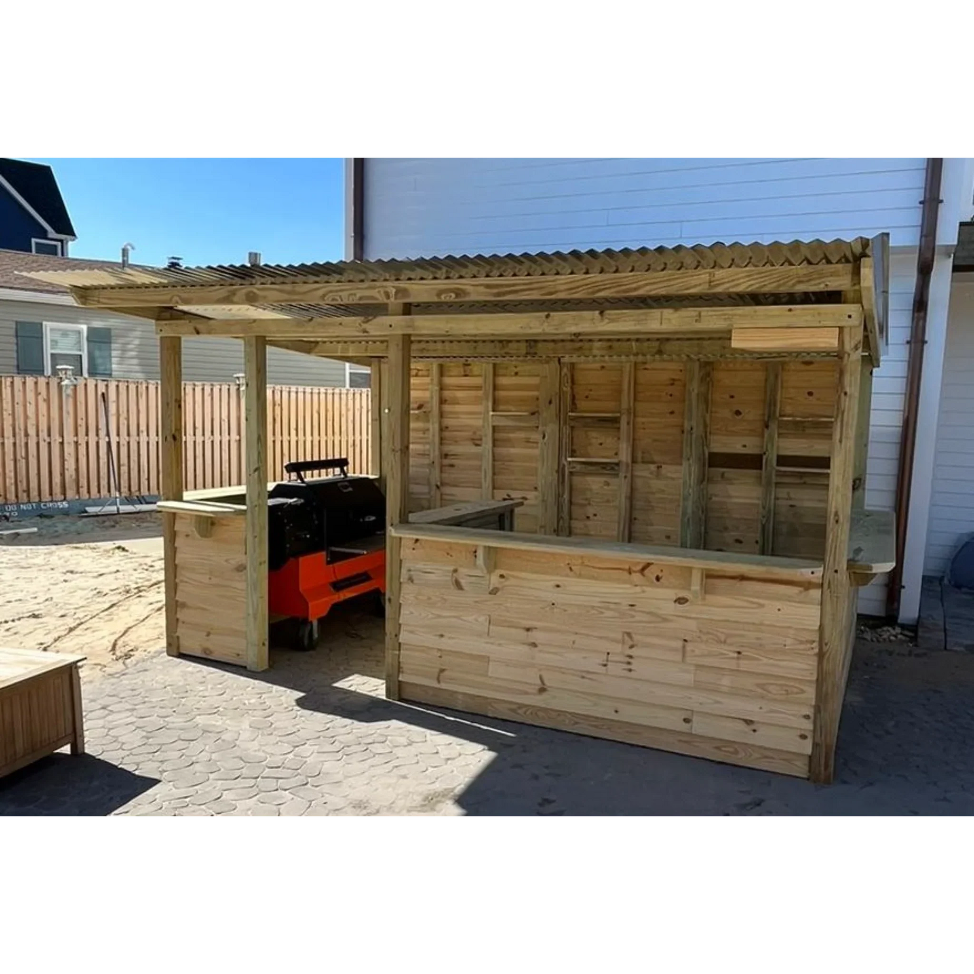 A combined backyard bar and grilling station designed for entertaining.