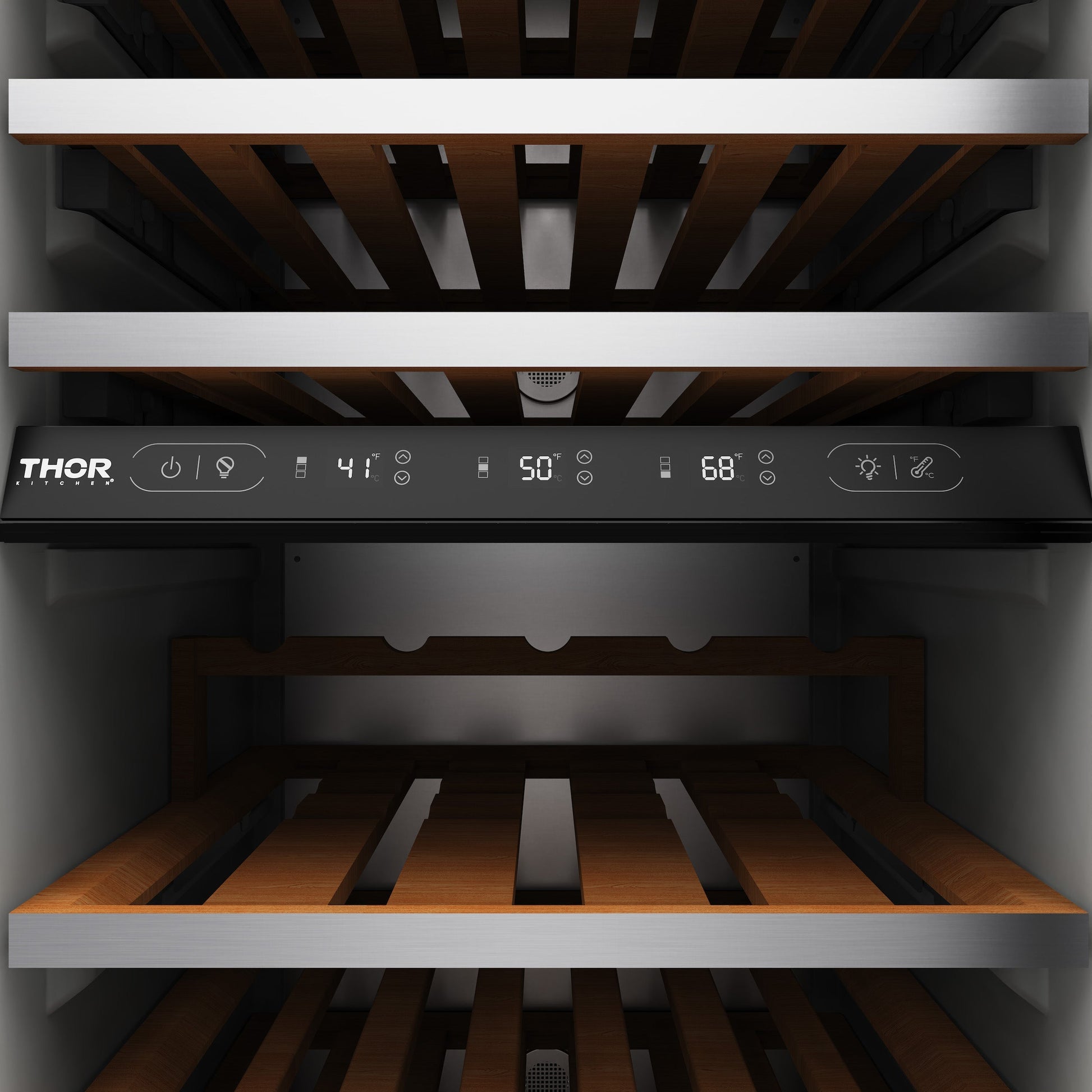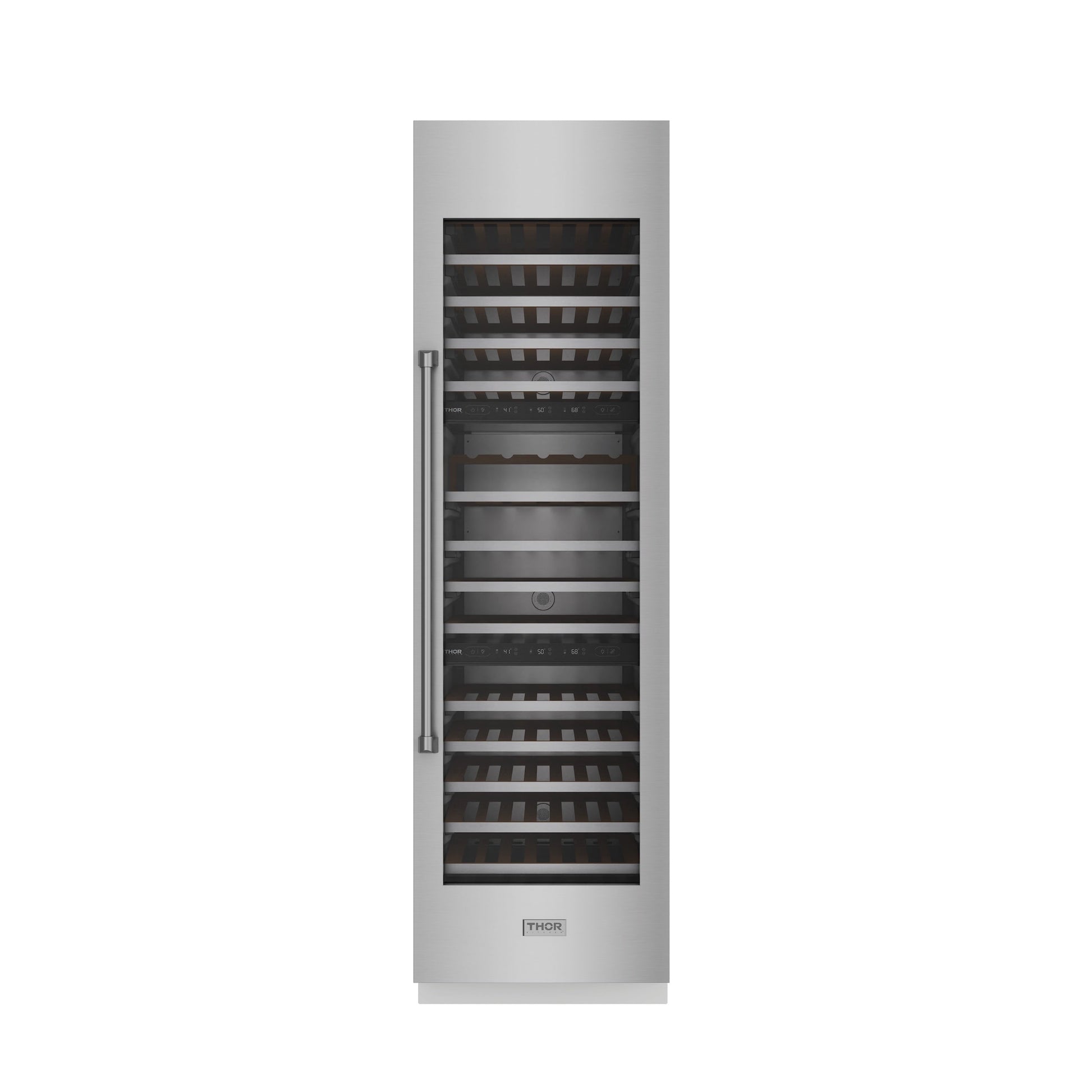 THOR Kitchen offers the power and performance of a premium professional appliance at a practical price. The XRF24CWC Built-in Wine Cooler combines precise temperature control with sophisticated design to elevate your wine storage. Tri-zone cooling keeps red, white, and sparkling wines at ideal temperatures (41°F–68°F), while full-extension beech wood shelves and a dedicated display rack provide easy access and a high-end look. Interior LED lighting with three color options creates the perfect ambiance, and triple-ply UV-protected glass with frost control preserves your collection in optimal conditions. With a 100-bottle capacity, touch controls, Sabbath Mode, and a charcoal filtration system, this cooler blends functionality, style, and performance for serious wine enthusiasts.