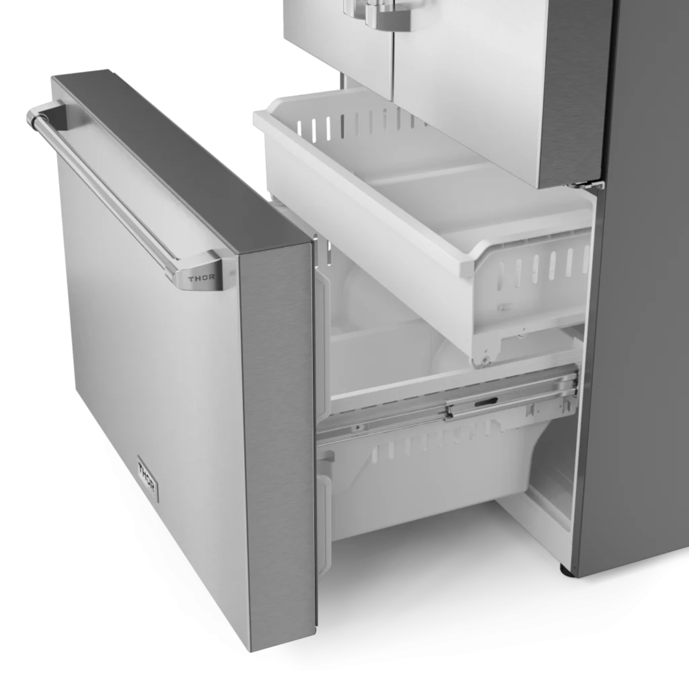 THOR Kitchen offers the power and performance of a premium professional appliance at a practical price. Upgrade your kitchen with this premium 36-inch full-depth French doo refrigerator, offering a spacious 28.9 cu. ft. capacity and sleek stainless steel design. Engineered for performance and convenience, it features a dual ice maker, external water dispenser, and smart storage solutions for every household need.