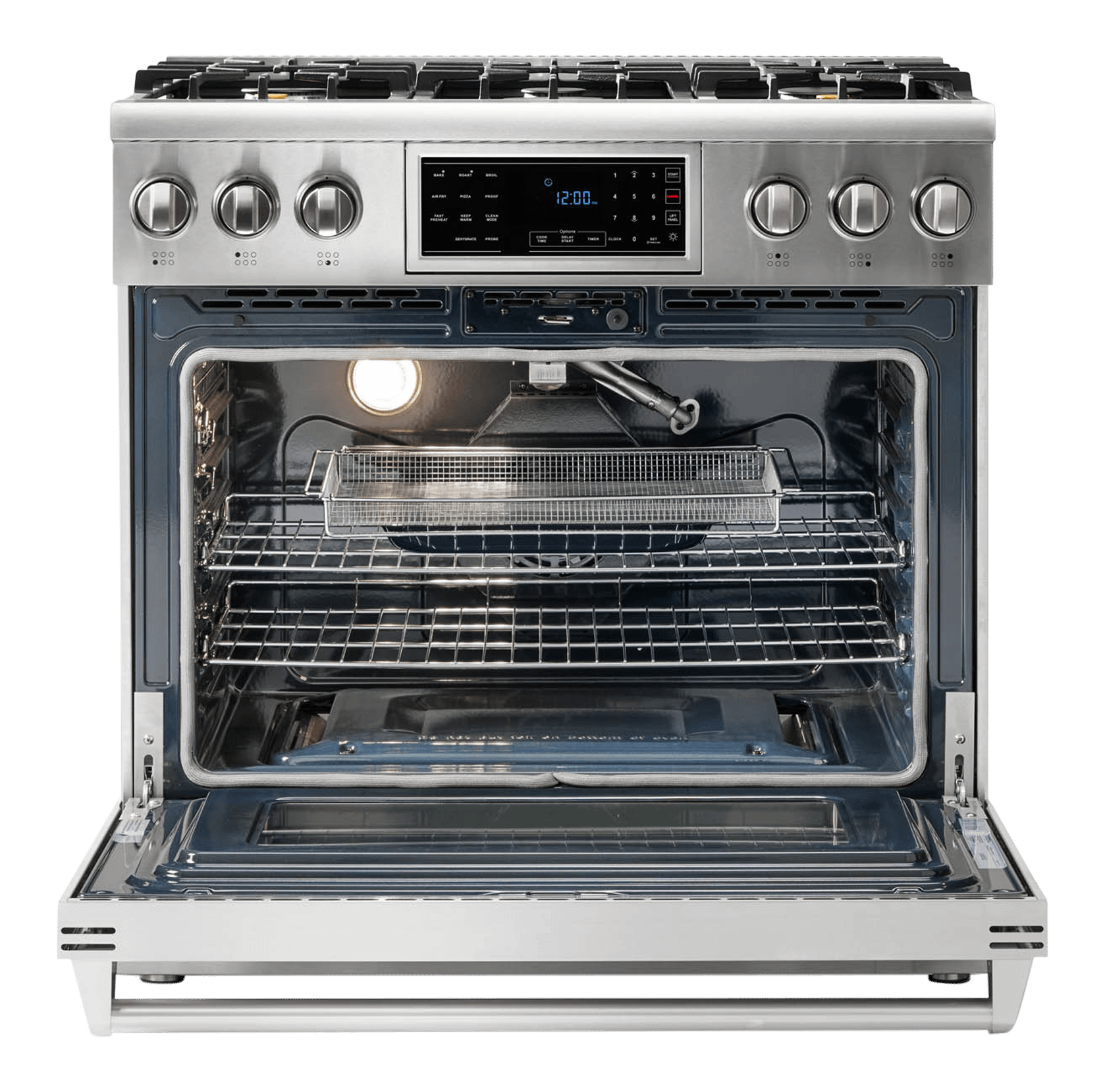 A: A 36-inch professional-grade gas range with six sealed burners, a 6.0 cu. ft. convection oven, built-in air fry, and a tilt-control panel.