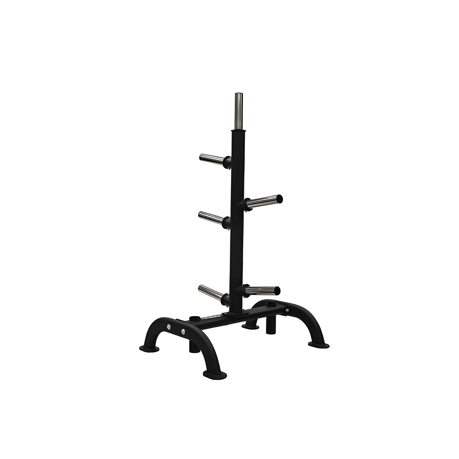 TKO's Olympic Weight Plate Tree with Bar Holders is constructed of an all-welded steel frame with stainless steel plate horns that hold up to a total of 600 lbs. of Olympic Plate.