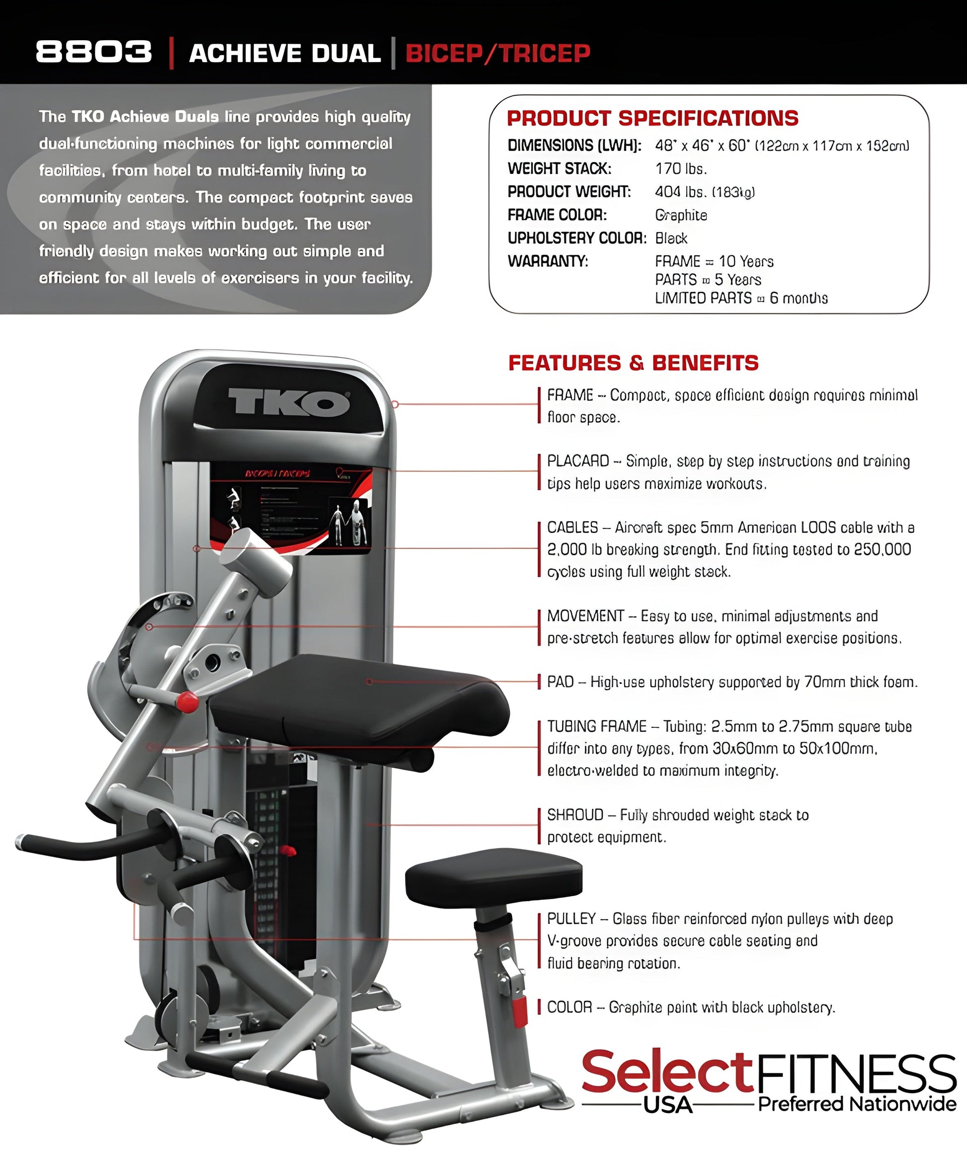 The TKO Dual Bicep and Tricep machine is built with heavy gauge, oval steel tubing that features a graphite colored finish for protection against ware, tear, moisture, scratches, and nicks.
