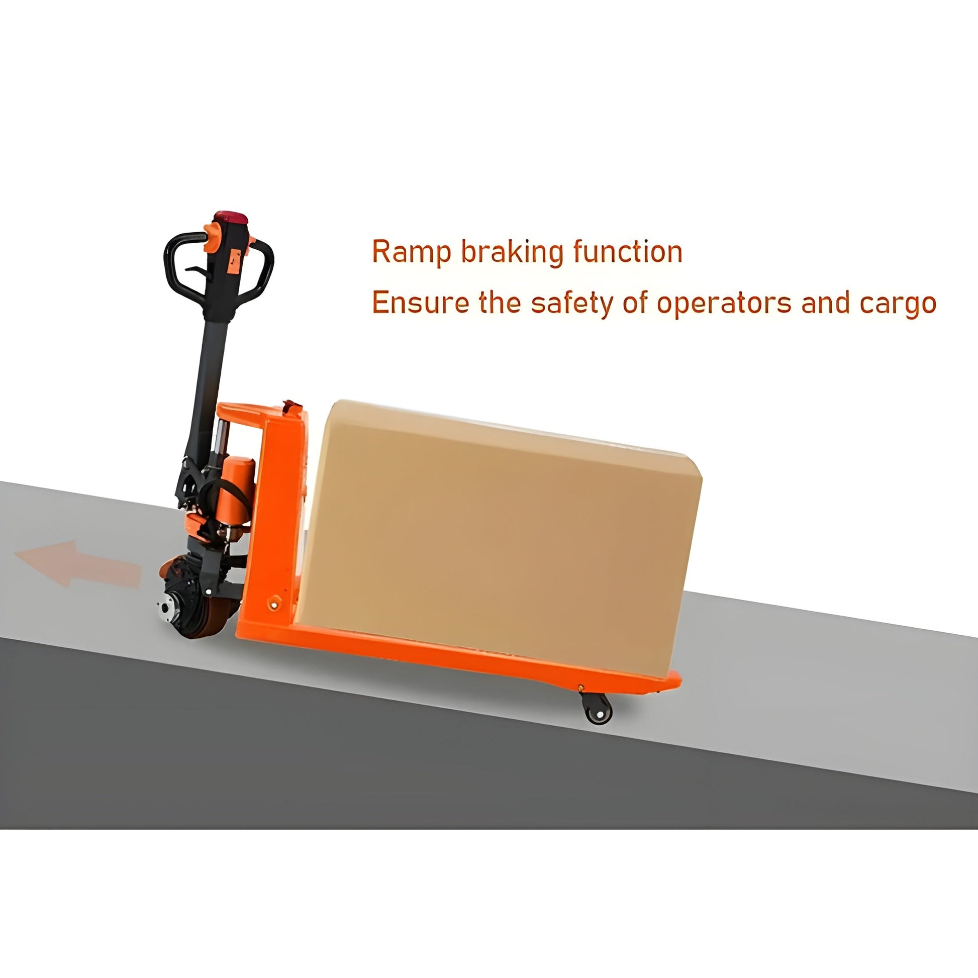 Indoor using type lithium battery electric pallet truck, with similar size as manual pallet truck, offer small turning radius, the electric pallet jack is super light and easy to operate.