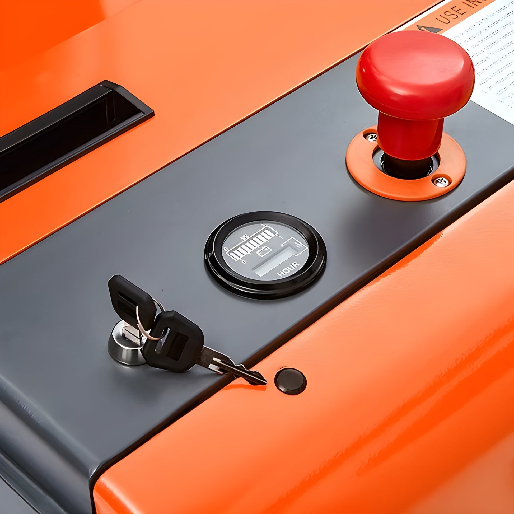 With emergency stop switch and electricity lock button, and multi-valve controlling levers, the 3,300 lbs stacker truck is ergonomic for operation. The adjustable regulator valve can adjust the lowing speed of the masts.
