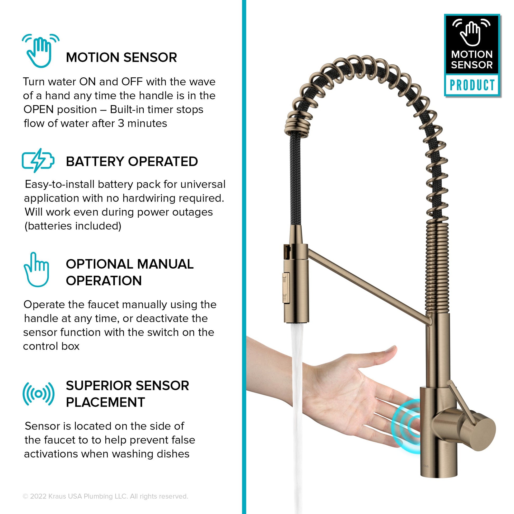 Create clean modern style in your kitchen with the streamlined silhouette of the Oletto™ Commercial Pull-Down Faucet, now available with touchless operation! Engineered with hands-free activation, this faucet allows you to turn water on and off with just the wave of a hand. The convenient design means that you can activate your faucet without touching the handle or spout when cleaning up, helping reduce germ transfer during messy tasks like preparing raw foods. The sensor sits on the side of the faucet to help prevent accidental activation when washing dishes and performing other kitchen tasks. A built-in timer automatically stops the flow of water after 3 minutes to help prevent water waste. QuickDock™ mounting technology allows you to easily install your faucet to the sink deck or countertop from above, with no need to secure it underneath the sink. The design features an industrial open coil spout and pull-down sprayhead with Reach™ technology for easy maneuverability and an extended range of motion, allowing you to bend, flex, pivot, and reach all around the kitchen sink. The dual function sprayer switches from aerated stream to powerful spray for rinsing dishes and washing away stubborn residue. Heavy-duty construction and premium components help ensure long-lasting use. For ease of installation, the Oletto™ faucet comes with 4x AA batteries, pre-attached water lines and all mounting hardware included. Available in multiple finishes, including spot-free options