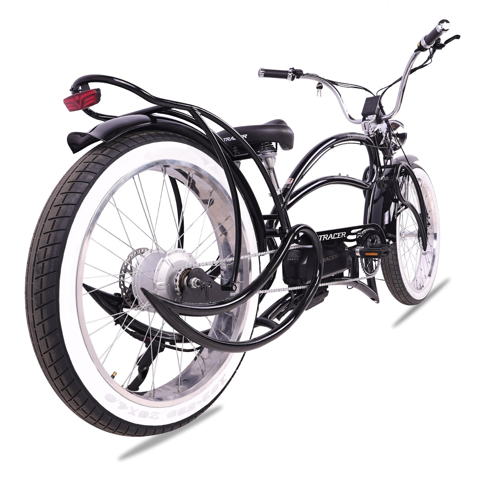 Introducing the Tracer Classic Stretch Chopper Hi-Ten Steel Electric Bike, the perfect combination of style, power, and comfort. With a sleek and stylish design
