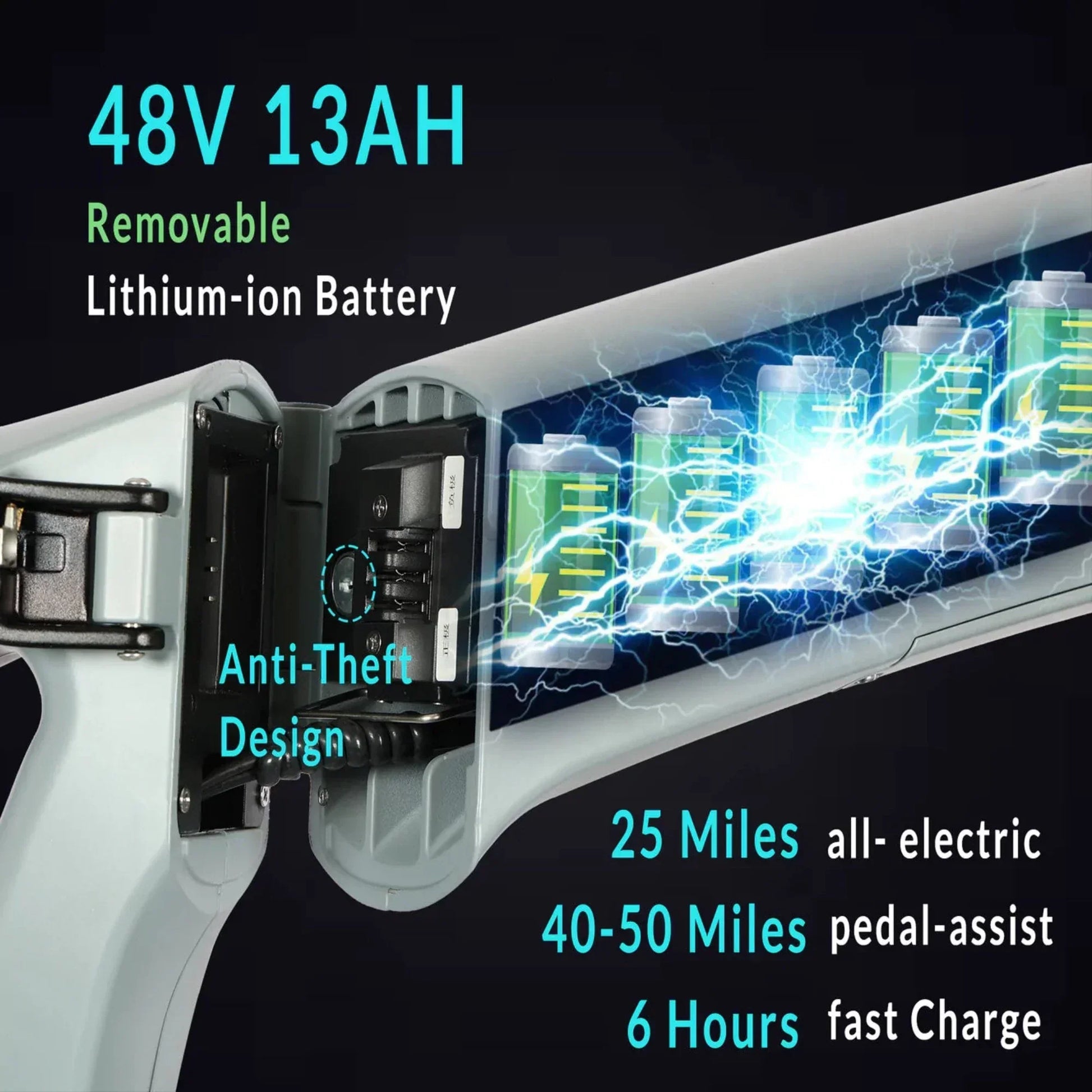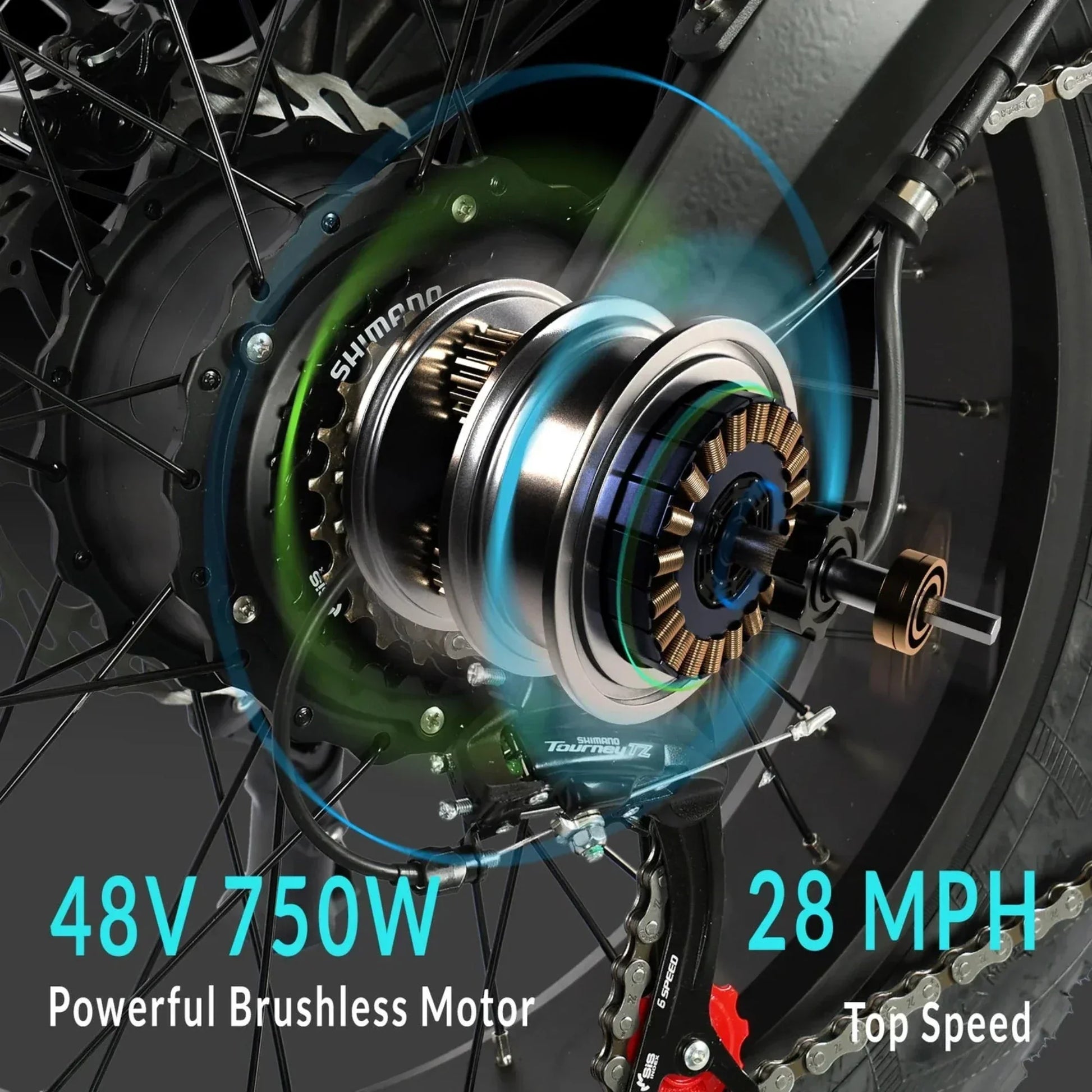 | Rear Hub Motor | 48V, 750W High-Speed Brushless, Max Speed 28 mph |
