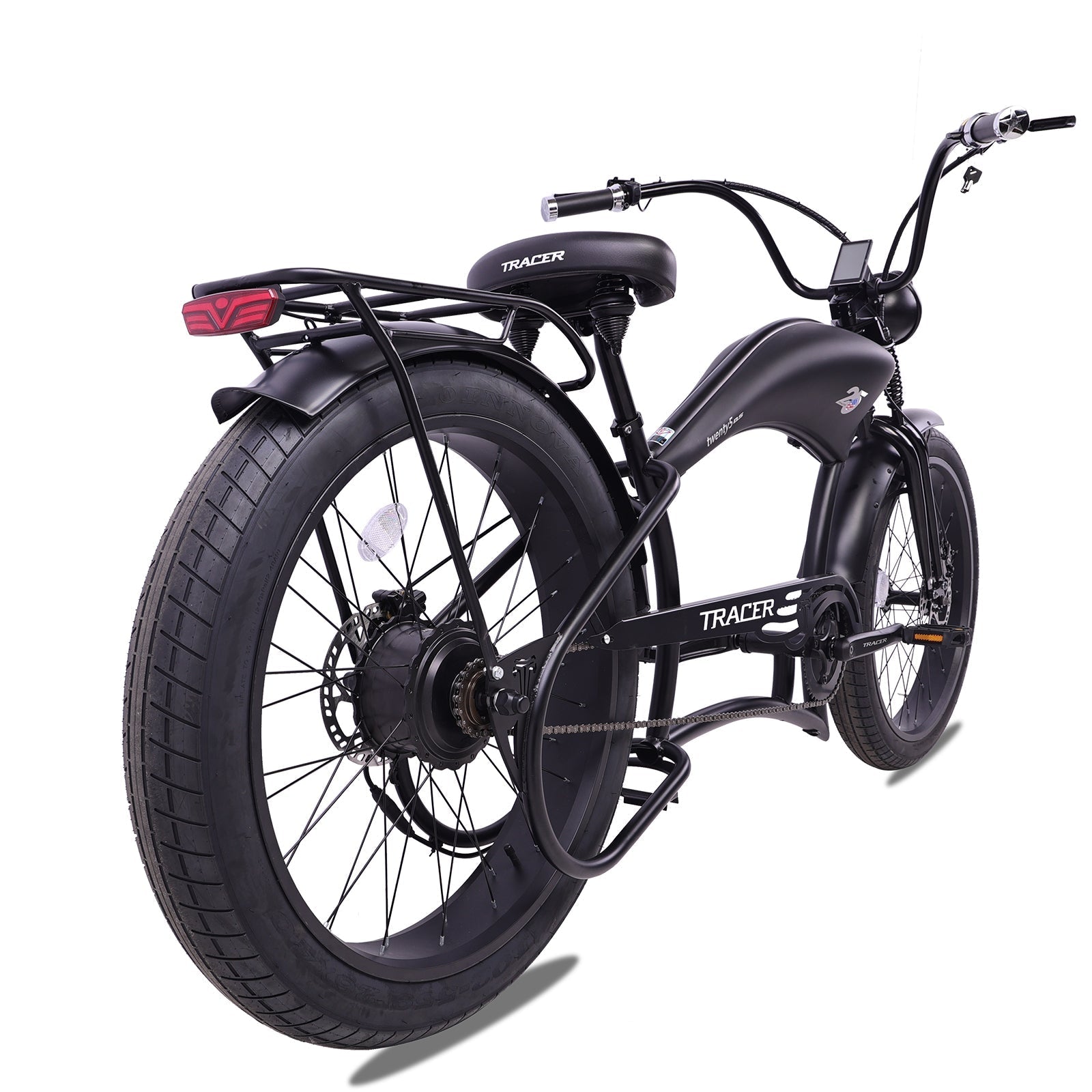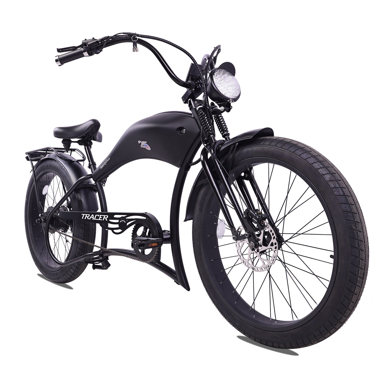 The Tracer 800W Twenty5 is a 26" chopper-style electric cruiser bike featuring an 800W motor, a high-capacity battery, and a stylish, durable frame. It’s designed for riders looking for a powerful and comfortable ride with a unique, retro flair.