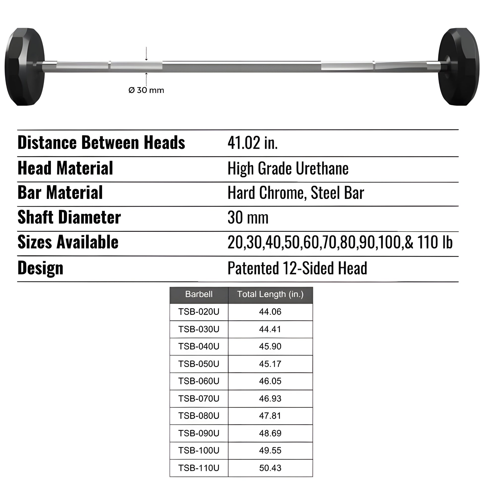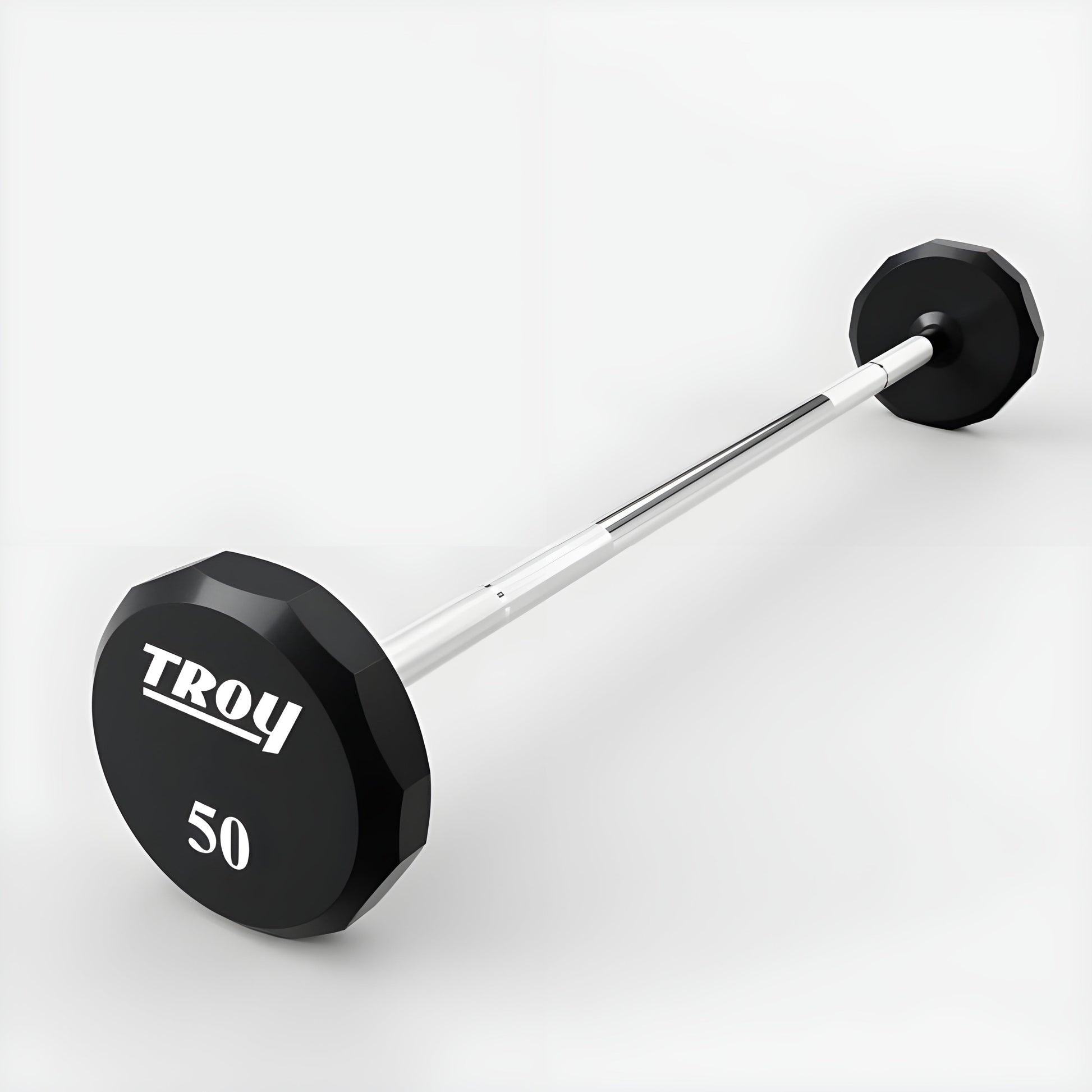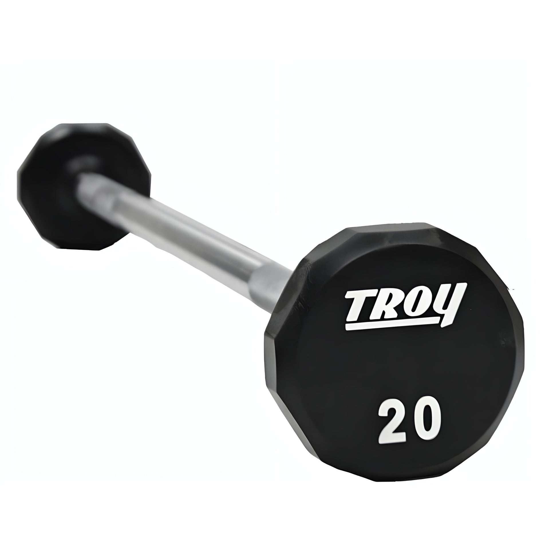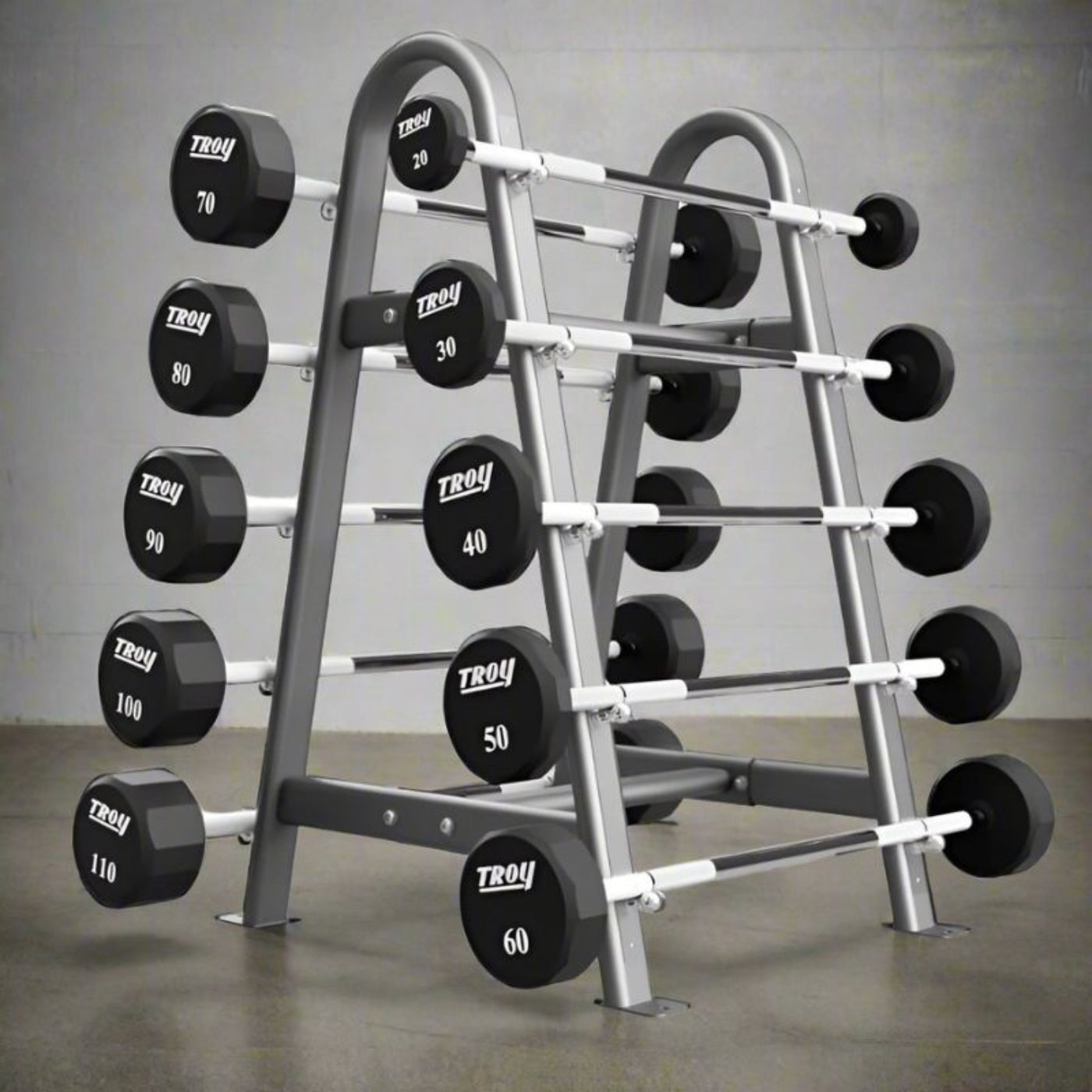 Looking for a Premium Straight Barbell Set? Get the Troy 12-Sided Urethane Straight Barbell Set with Rack!The Troy 12-Sided Urethane Straight Barbell Set with Rack is the ultimate solution for gyms, fitness centers, and home workout spaces. This high-quality barbell set with rack provides 10 fixed-weight straight barbell set options, ranging from 20 lbs to 110 lbs, all neatly stored in a space-efficient barbell rack storage unit. Each barbell is designed with solid steel heads, encased in high-grade urethane, and attached to a durable, hard-chrome steel bar—ideal for heavy lifting and long-term performance.Upgrade Your Training Setup!Take your gym to the next level with the Troy 12-Sided Urethane Straight Barbell Set with Rack. This complete barbell set with rack ensures smooth workouts with a space-saving barbell rack storage design. Whether you're looking for a durable barbell option or a professional straight barbell set, this is the ultimate choice. Order yours today and transform your workout space