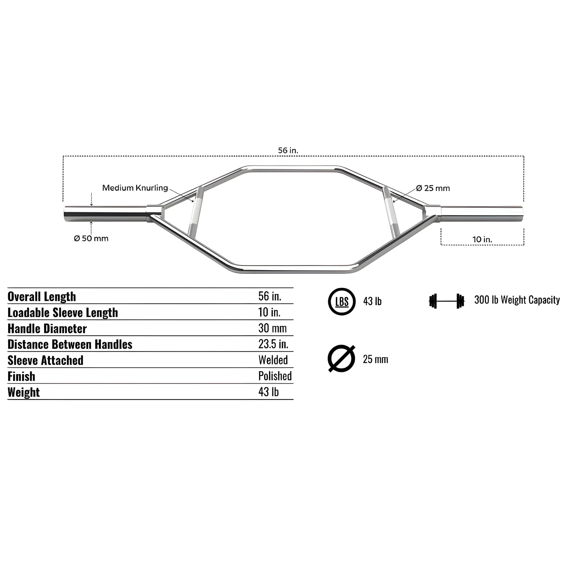 The Troy GOT-56 International Hex Bar is designed with a generously sized diamond pattern grip, making it suitable for users of all levels. This hex bar offers superior efficiency for deadlifts and shoulder shrugs by shifting the weight load to the knees and thighs rather than the hips and lower back. As a result, it reduces strain and lowers the risk of injury. Whether you're outfitting an institutional gym or a heavy-duty home setup, the olympic hex bar is built to handle your toughest workouts.