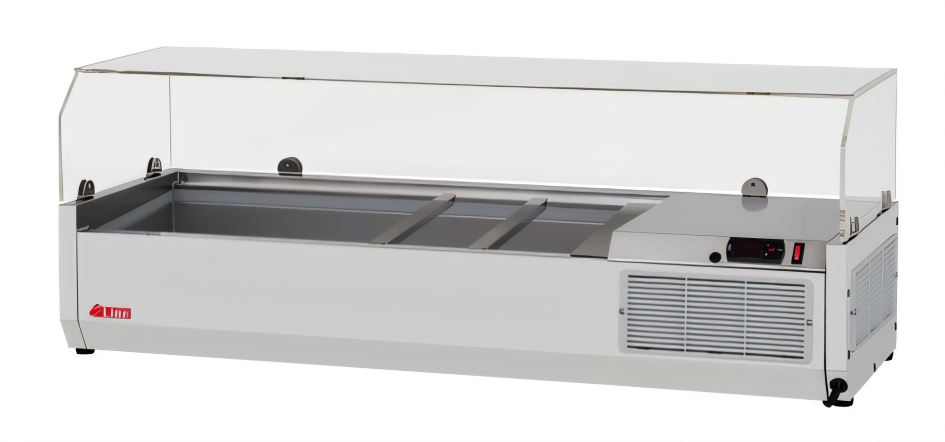 Add a high-performance cold prep station to even the tightest kitchen, deli, or catering line. The E-Line countertop salad table keeps toppings, proteins, and garnishes at a food-safe 32°F–41°F, all while showcasing them behind a crystal-clear hood that invites impulse sales and protects product integrity.