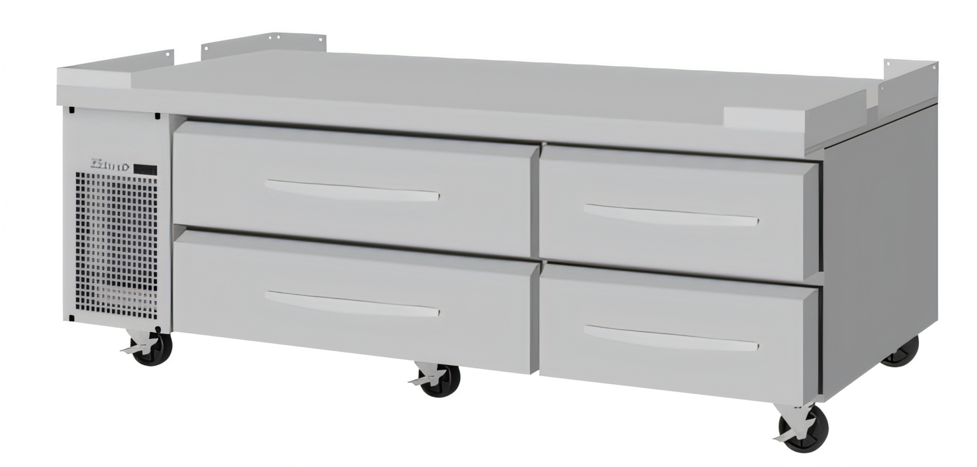 A: A PRO Series refrigerated chef base (freezer) with four stainless steel drawers and a stainless steel flat top, providing under-counter frozen storage and workspace for commercial kitchens.