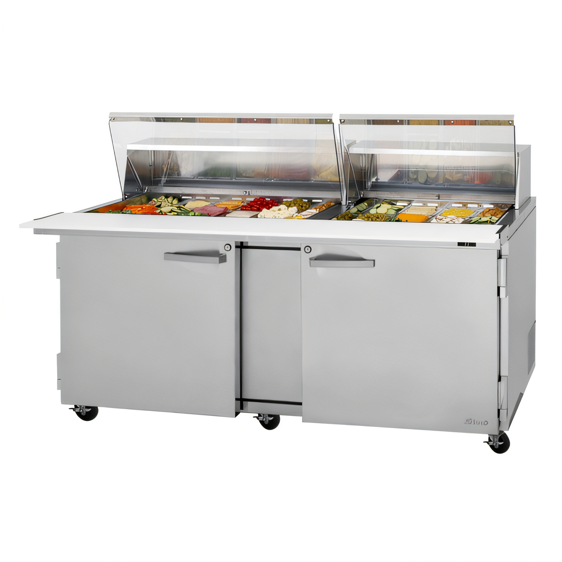 Keep up with the lunch rush and protect your ingredients with the 72-inch Turbo Air PRO Series Mega Top. A patented cold-air “bunker” system, daily self-cleaning condenser and all-stainless construction give you reliable, food-safe performance in the toughest commercial kitchens.