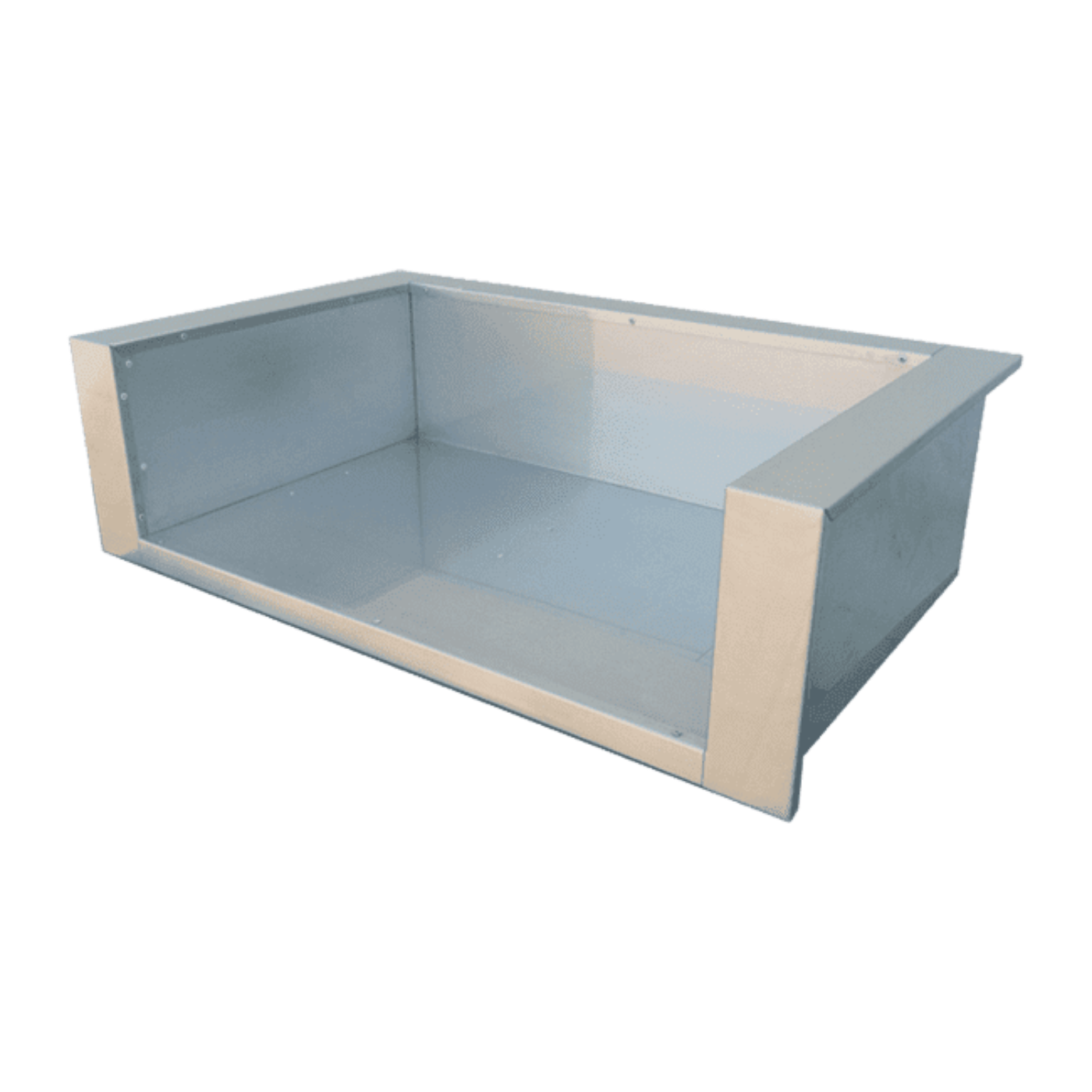 A: It features durable, corrosion-resistant construction with an insulating barrier to contain heat, protecting surrounding cabinetry and ensuring optimal grill performance.