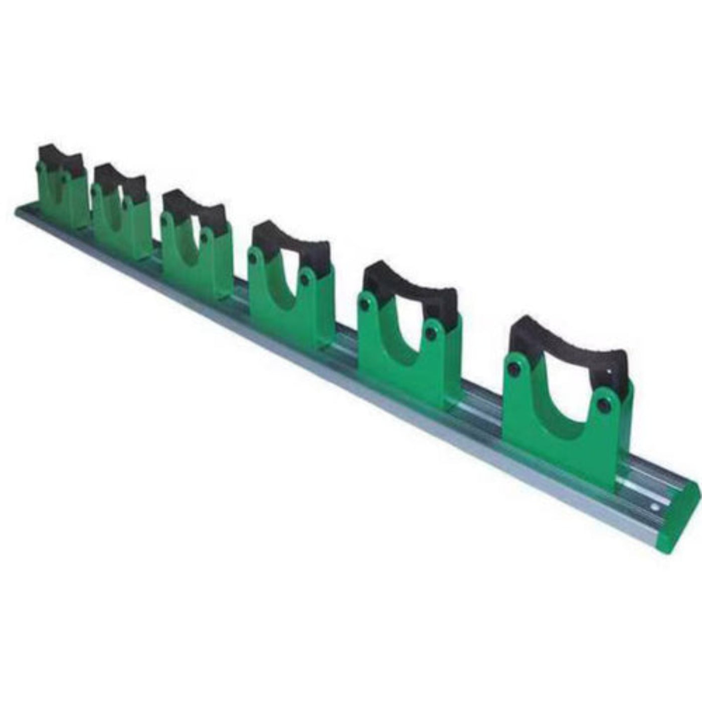 This mop & broom handle holder has 6 rubber snap in channels that hold varying sized handles in place. You can now get your mops and brooms of the ground for easy drying. These holder keeps them organized and all in one place. The 6 snap in holders ride in a 28" track and slide horizontally to adjust for individual tools/handles. The necessary hardware is located to mount on a flat surface. Absolutely perfect for hanging your mop handles, push broom/squeegee handles, and brooms/dustpans in a garage or closet. This item is sold as a case with 5 hangers in each case.