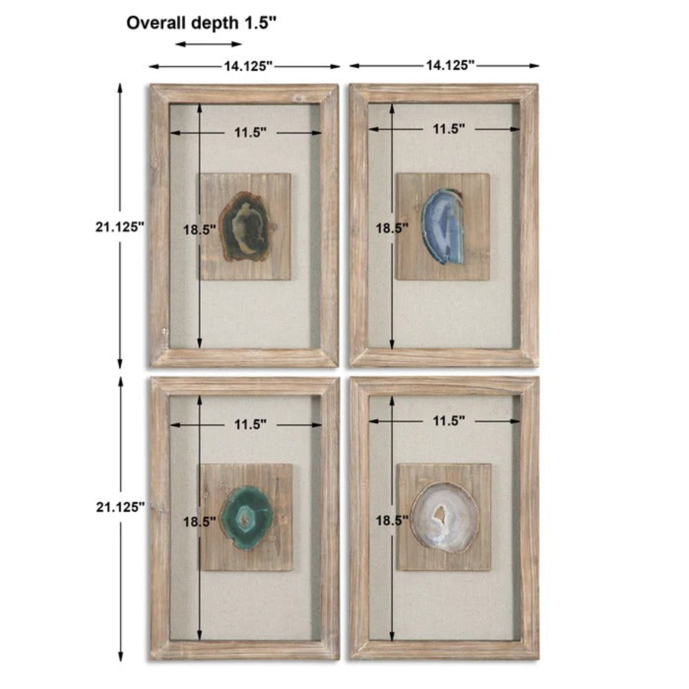 Solid wood shadow boxes feature light gray wash, encasing slabs of colorful agate stone under glass with a linen background. The agate stone will vary in shape and color. Uttermost's framed wall art combines high-quality materials with unique design, advanced product engineering, and packaging reinforcement, resulting in low damage rates and improved shipping.
