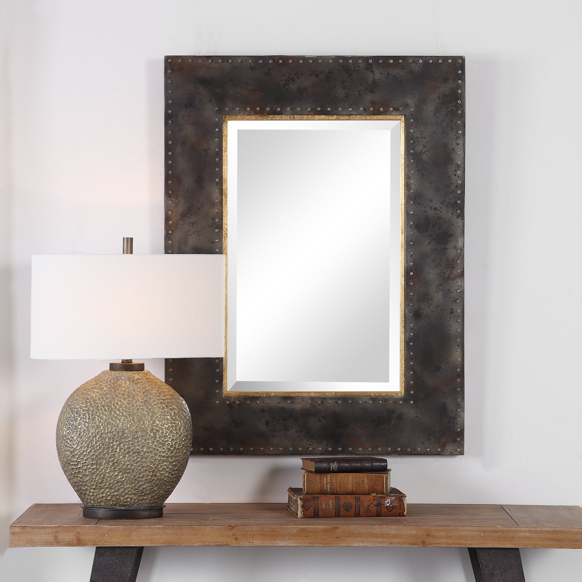 This industrial-style mirror features an oxidized steel gray finish with exposed brass nut and screw details, and a petite antiqued gold leaf inner frame. The generous 1 1/4" bevel allows for vertical or horizontal hanging. Uttermost produces mirrors with premium materials and unique styling, designed with shipping in mind and some of the industry's lowest damage rates.