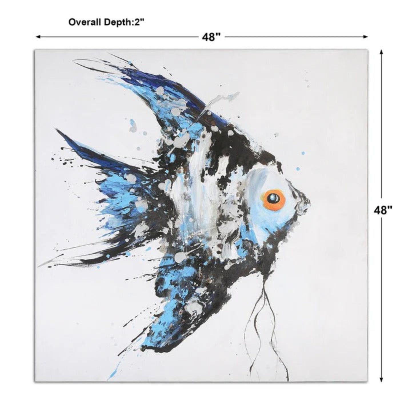 A: A hand-painted canvas wall art featuring a blue angelfish, designed for coastal- or ocean-inspired décor.