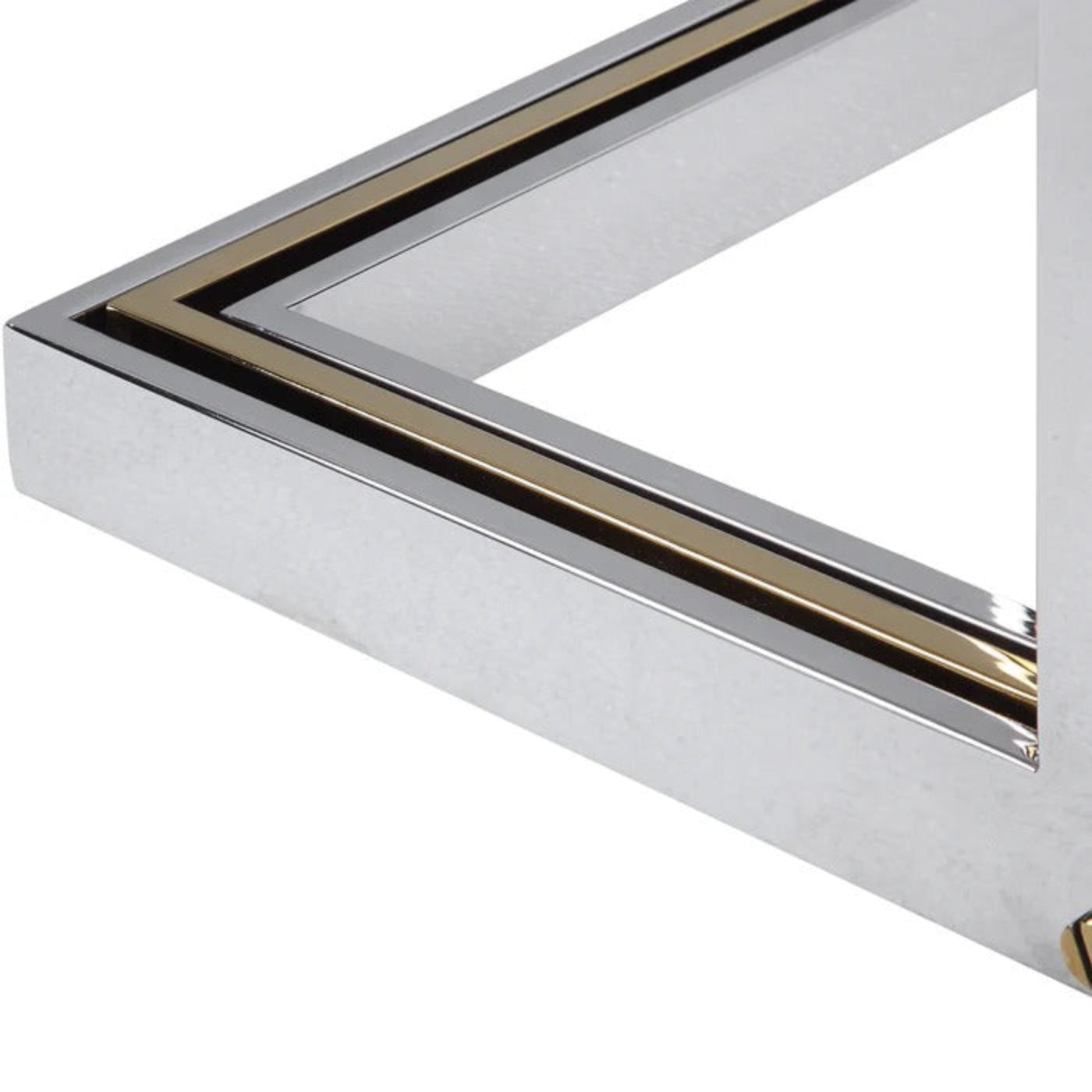 Asymmetrical dual-toned frame with polished nickel and gold finishes paired with a clear tempered glass top creates a striking contemporary-glam look.