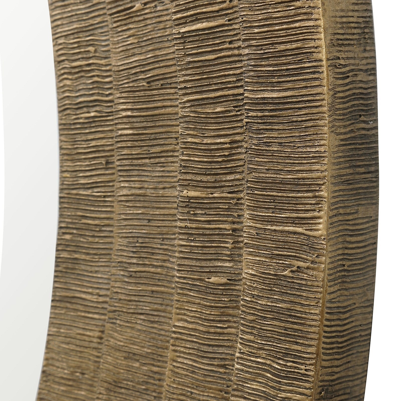The Uttermost Relic Aged Gold Round Mirror 09647 features a hand-carved textured frame in aged gold, blending tribal or bohemian influences with modern or transitional interiors.