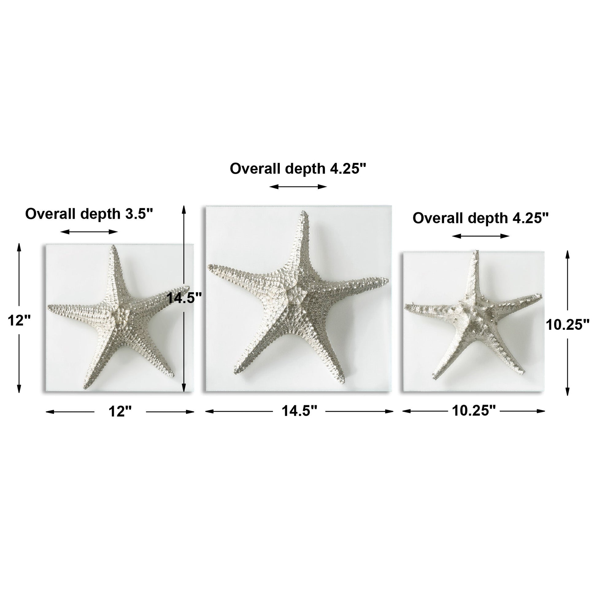 Delightful silver starfish replicas are attached to 1/4" thick, clear glass plaques and feature a metallic silver finish. Sizes: Small 10x10x4, Medium 12x12x4, and Large 15x15x4. Uttermost art combines quality materials and high-style design with advanced engineering and package reinforcement for minimal damage during shipping.