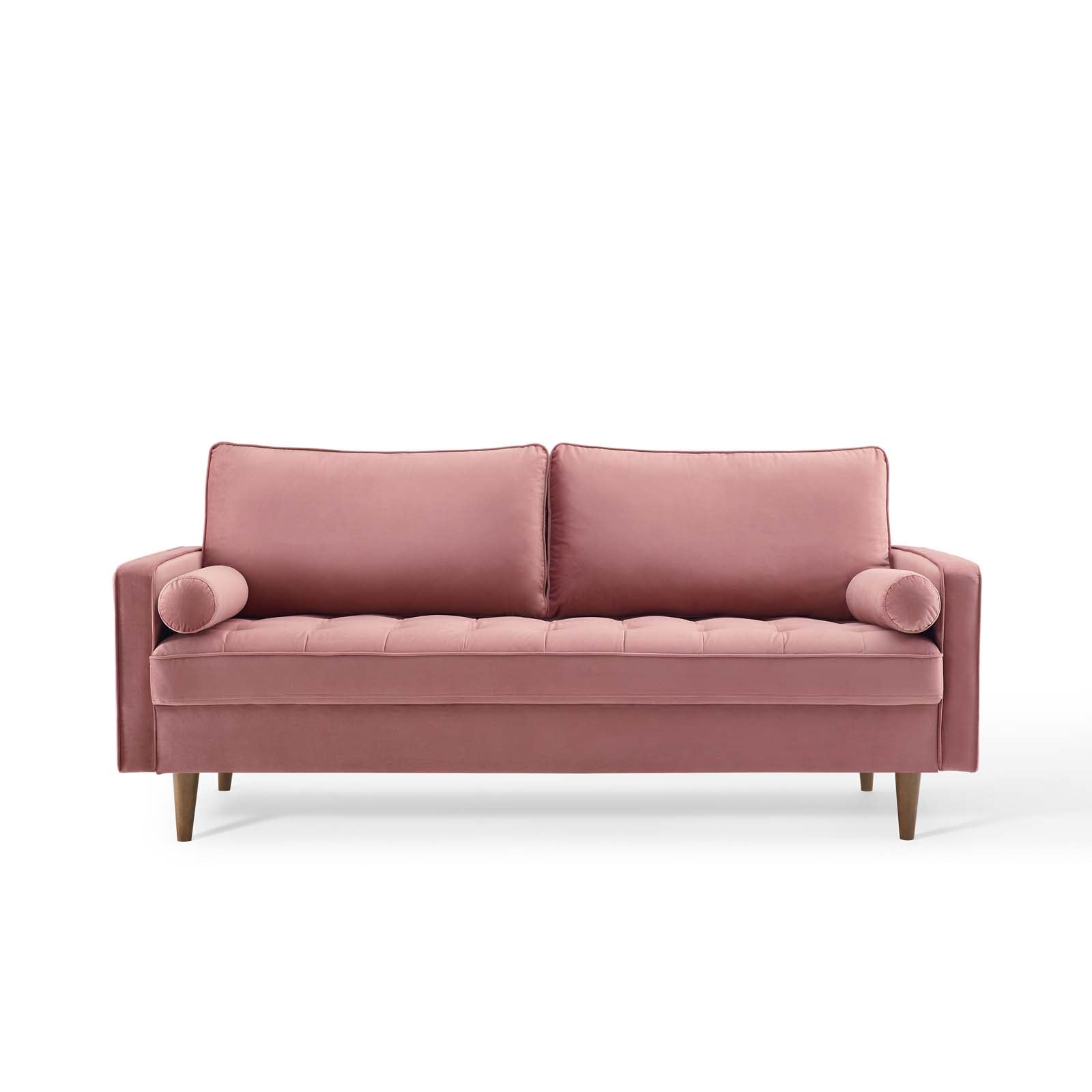 The Modway Valour Sofa is a mid-century modern-inspired piece that combines style and comfort. Upholstered in stain-resistant performance velvet, it features elegant biscuit tufting, a tailored profile, and walnut-stained wood legs, making it a sophisticated addition to any living space.