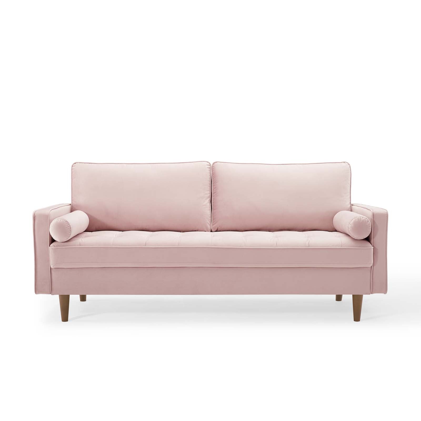 Update your home or apartment with the mid-century style and modern-day convenience of Valour. This comfortable living room sofa features a tailored profile with elegant biscuit tufting and two bolster pillows. Covered in soft, stain-resistant performance velvet upholstery, Valour has dense foam padding, individually wrapped innerspring pocket coils, and sinuous spring support for a comprehensive seating experience. This luxe modern sofa comes with walnut-stained wood legs with non-marking foot caps and supports up to 881 lbs. Say goodbye to the days of hauling heavy furniture. This tufted sofa ships in a portable box for easy maneuvering.